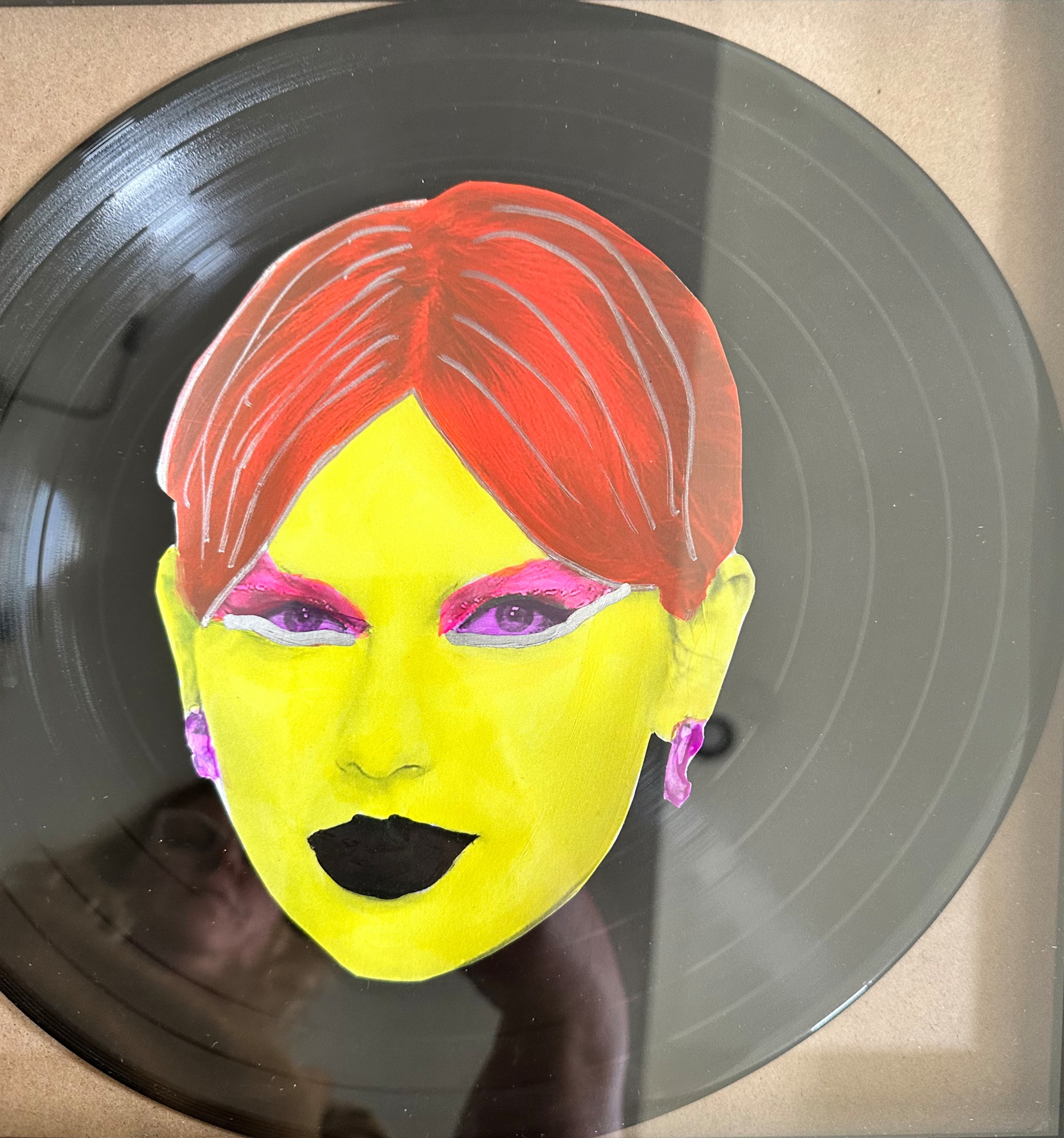 The “destruction of the sacred” by gluing art onto vinyl albums (that were sacred in Stafford’s childhood home) gave her the same feelings of guilt as if she’d desecrated the American flag ala Mapplethorpe or Dread Scott. And finally the glitter paint pen work evokes memories of 80s kids with stickers and markers drawing in a yearbook. The choice of Taylor Swift in the place of Marilyn Monroe was deliberate as Taylor has referenced herself as a product that she wants 100% control of the marketing and profit from.