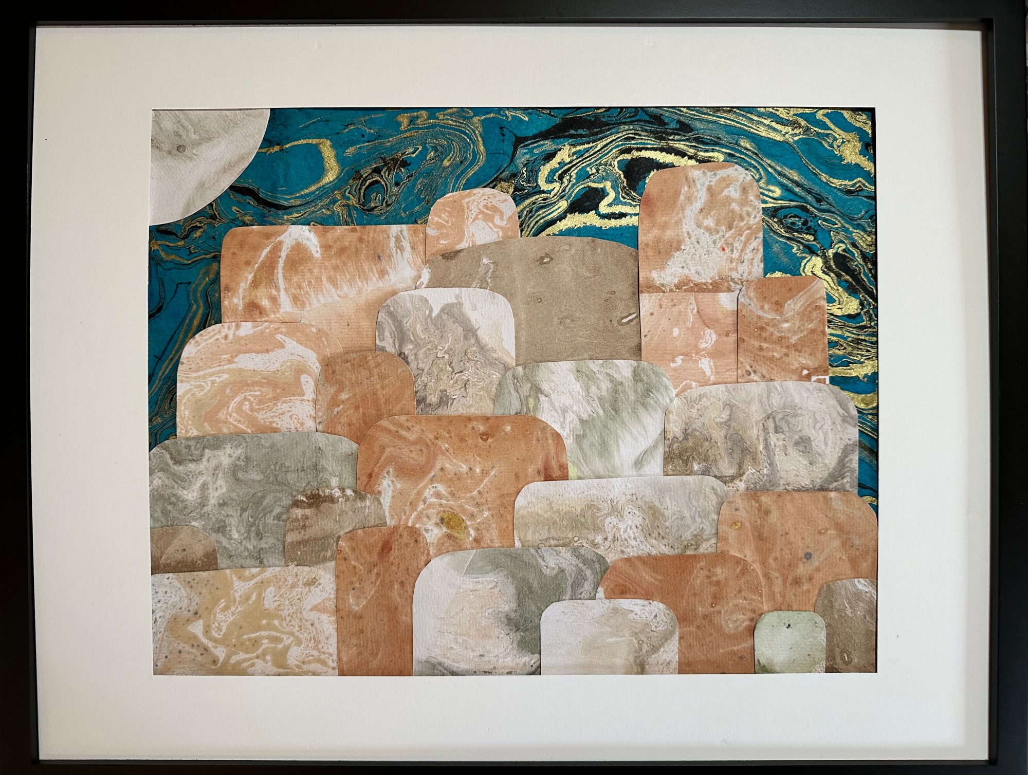 Oil marbleized watercolor paper on Japanese oil paper. 14×11 matted to 18×14. Using a marbleizing process, mixing oil paint and turpenoid, I drop paint on a pan of water. Then, swirl it and lift the pattern with a piece of heavy watercolor paper. Pressing those pages to make them flat, I then cut patterns of the paper to make my image using light and shadow to determine the shapes, as well as the actual shapes and forms of the object I am portraying. All of this is applied to Japanese handmade paper to form an impression of the feelings and scenes I've encountered.