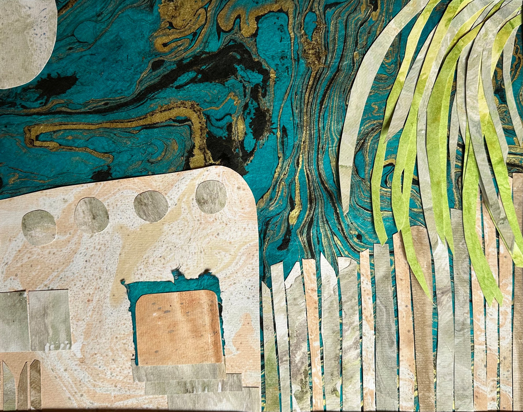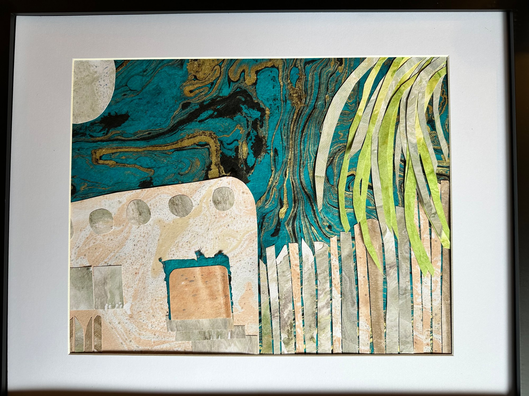 Oil marbleized watercolor paper on Japanese oil paper. 14×11 matted to 18×14. Using a marbleizing process, mixing oil paint and turpenoid, I drop paint on a pan of water. Then, swirl it and lift the pattern with a piece of heavy watercolor paper. Pressing those pages to make them flat, I then cut patterns of the paper to make my image using light and shadow to determine the shapes, as well as the actual shapes and forms of the object I am portraying. All of this is applied to Japanese handmade paper to form an impression of the feelings and scenes I've encountered.
