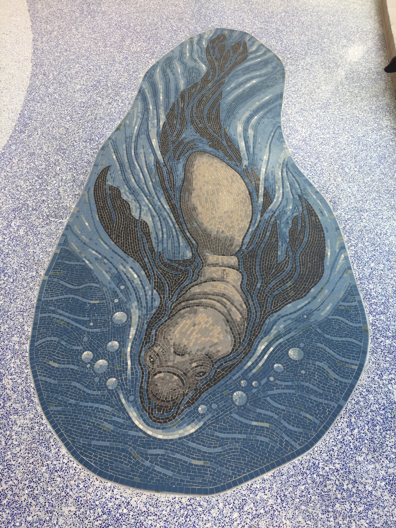 Gary Drostle, A Walk along the Seashore, 2017, porcelain tile mosaic, 132 x 66 inches, Lucile Packard Children’s Hospital at Stanford, Main. Embedded in the lobby Floor, the larger mosaic installation includes ten hand-cut ceramic mosaic floor panels and six cast bronze sand dollars.