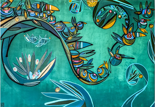 David (Lebo) Le Batard, All Birds on a Branch, 2022, brushed aluminum artbond, 24 x 34 inches, Stanford Medicine | Children's Health. Donated by Roth Auxiliaries member Diann Major. Demonstrating Lebo's preference for street art and cartoons, this work shows whimsical toucans perched on a curved branch.