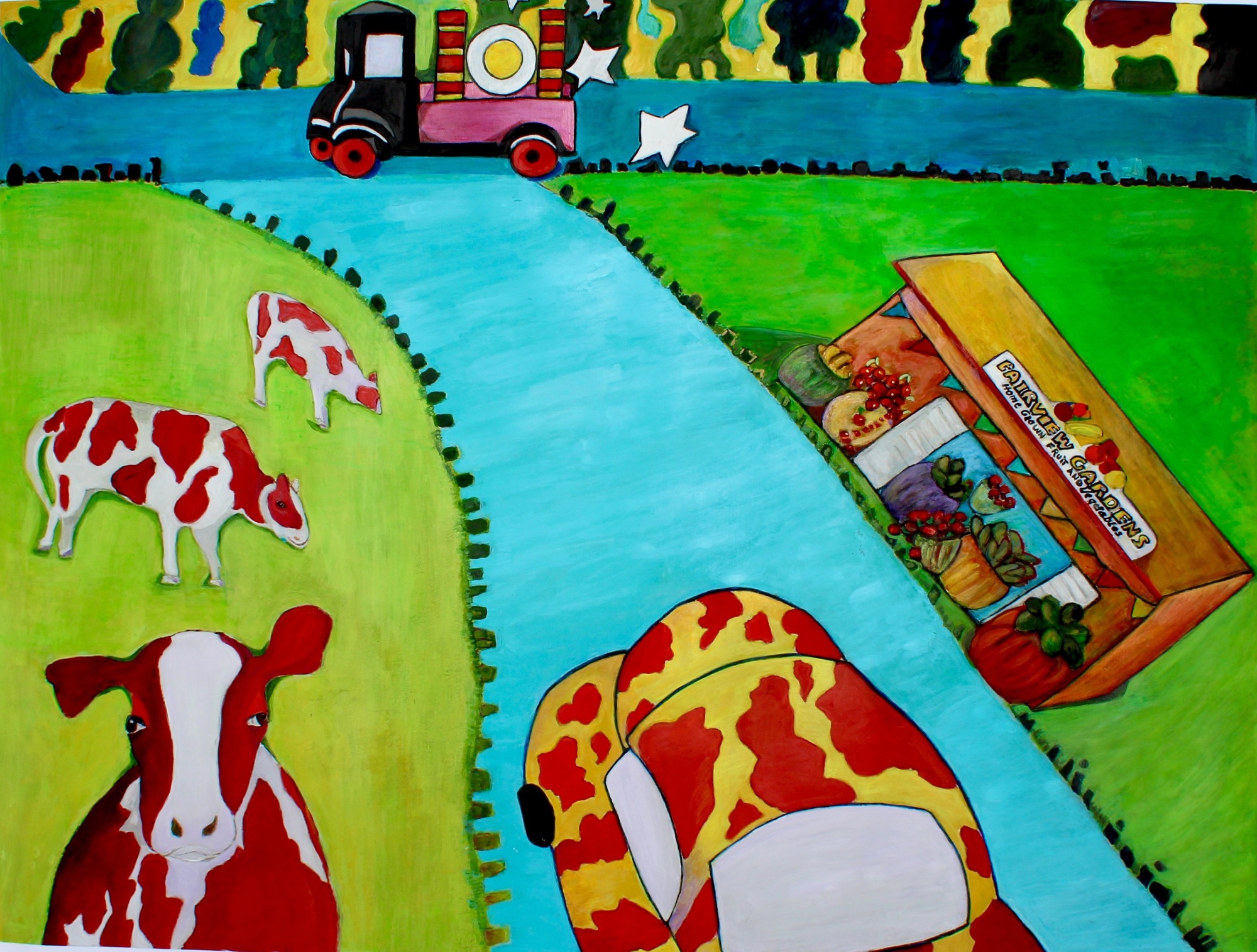 Flora Golden, Along the Way, New California Home, c. 2017, acrylic on paper, 36 x 46 inches, Lucile Packard Children's Hospital at Stanford, Main. A yellow and red spotted car drives down the road past a group of red spotted cows.
