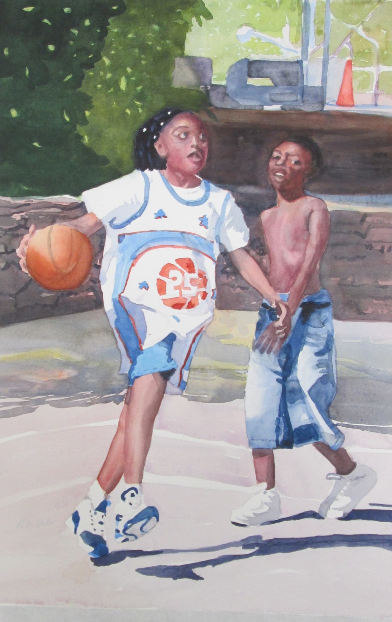 Rita Sklar, Basketball, Running in the Park, Boys on the Slide, c.2017, watercolor on paper, 22 x 15 inches, Lucile Packard Children's Hospital at Stanford, Main. Two children playing basketball.