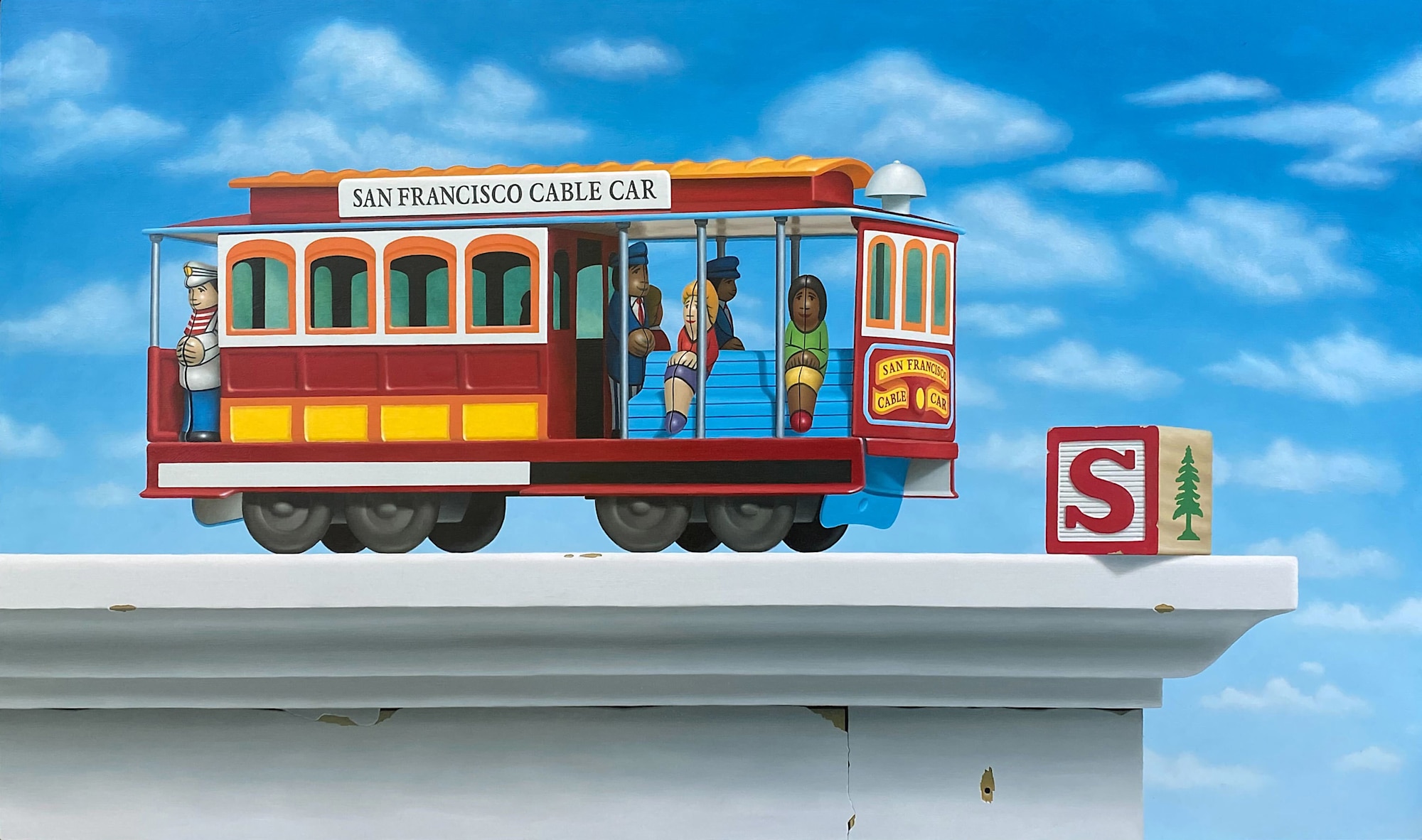 Ted Polomis, Cable Car to Stanford, 2024, oil on panel, 42 x 54 inches, Lucile Packard Children's Hospital at Stanford, West. This painting is a still life of toys with a whimsical nod to San Francisco's landscape--the cable car!