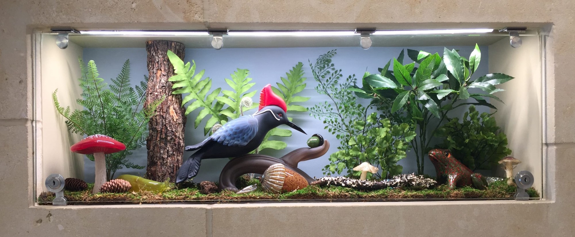 Cohn Stone Studio, California Dioramas - Forest, 2017, glass, plastic, wood, pine-cones, earth, 13 x 38 x 10 inches, Lucile Packard Children’s Hospital at Stanford, Main. Diorama of forest with real branch, acorn, and pine cones, as well as fabric and plastic leaves. There are also 10 blown and molded colored glass objects, including a toadstool, two mushrooms, two leaves, one acorn, a branch with woodpecker, banana slug, and toad.