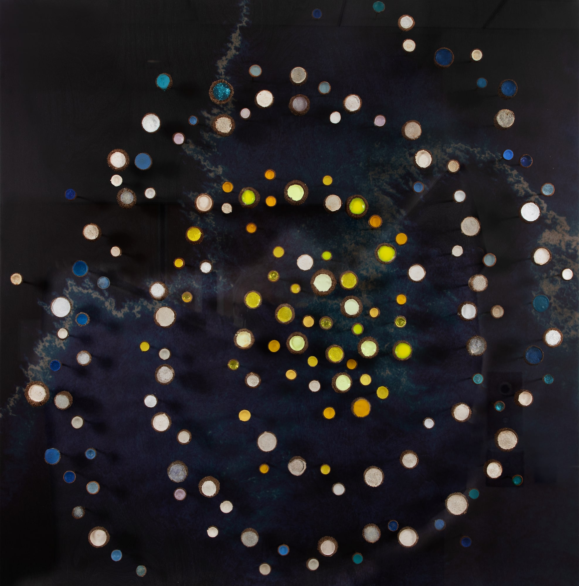 Julie Maren, Cosmos, 2023, acorn tops, acrylic paint, and brass rods, 42 x 42 inches, Lucile Packard Children's Hospital at Stanford, West. A wall-mounted sculpture, Cosmos represents the Milky Way made entirely out of acorn tops.