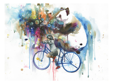 Lora Zombie, Creator of the Universe, 2013, giclée, 18 x 24 inches, Stanford Children's Health Specialty Services, Emeryville. Print of a panda on a bicycle, surrounded by colorful splashes.
