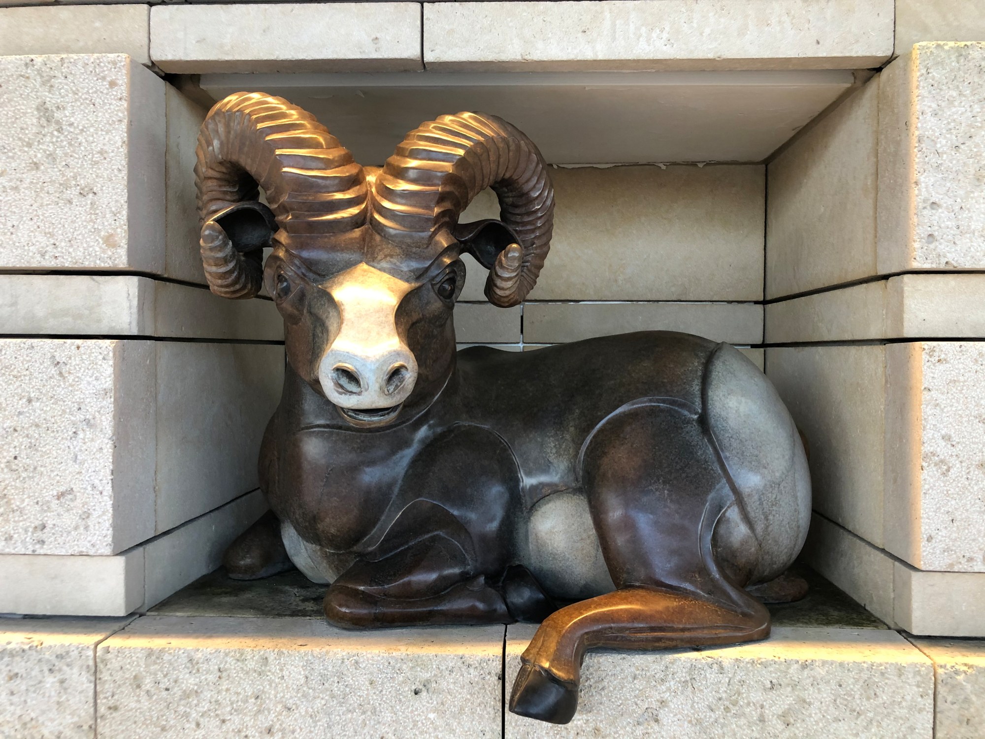 Pokey Park, Desert Bighorn Sheep, 2017, bronze, patina, paint, and lacquer, 22 x 28 x 18 inches, Lucile Packard Children’s Hospital at Stanford, Main. Cast bronze sculpture of a seated Bighorn Sheep.