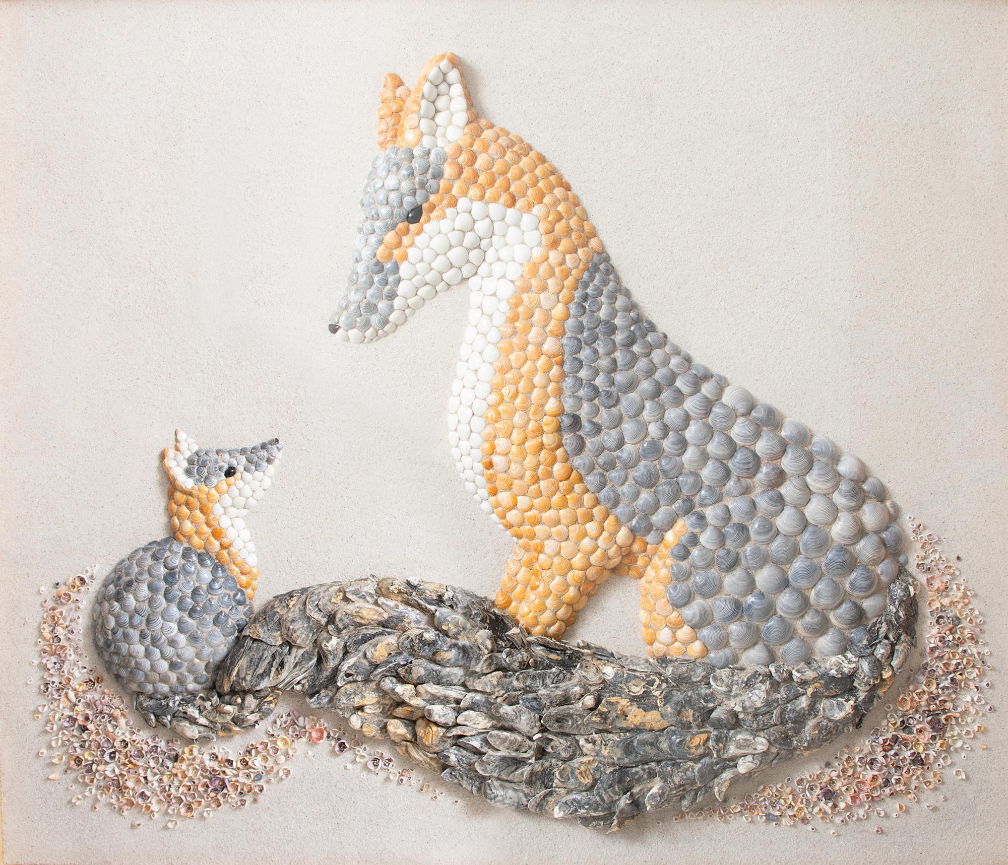 Anna Chan, Devotion, 2023, Mixed media (sand and seashells), 39 x 46 x 2.5 inches, Lucile Packard Children's Hospital at Stanford, West. Referencing wildlife in Northern California, “Devotion” depicts gray foxes, native to this region of the state, made out of sand and sustainability sourced sea shells.