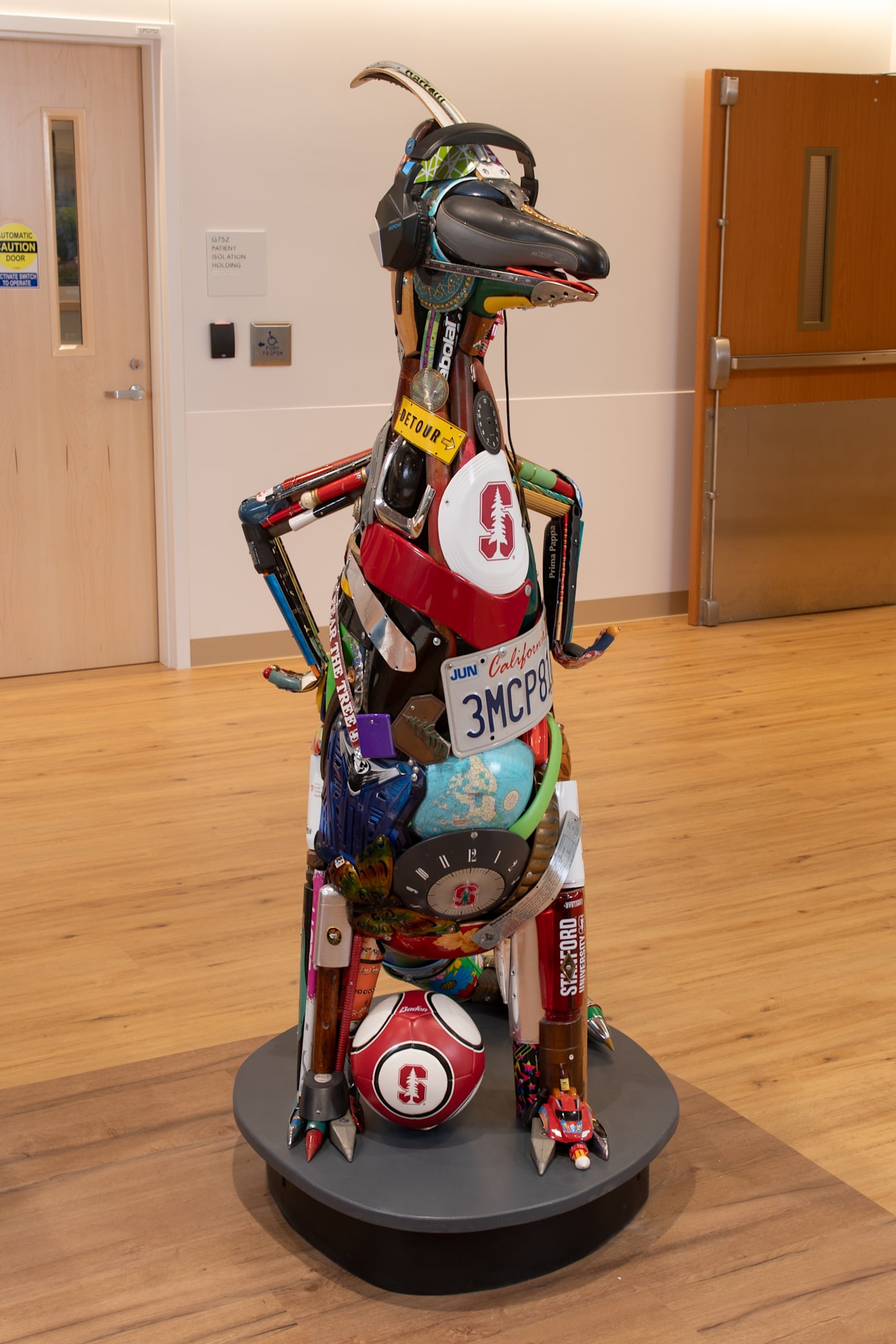 Leo Sewell, Dino, 2024, Reclaimed materials and Stanford swag, 57 x 32 inches, Lucile Packard Children's Hospital at Stanford, West. A hadrosaur made out of recycled, found objects and Stanford swag.