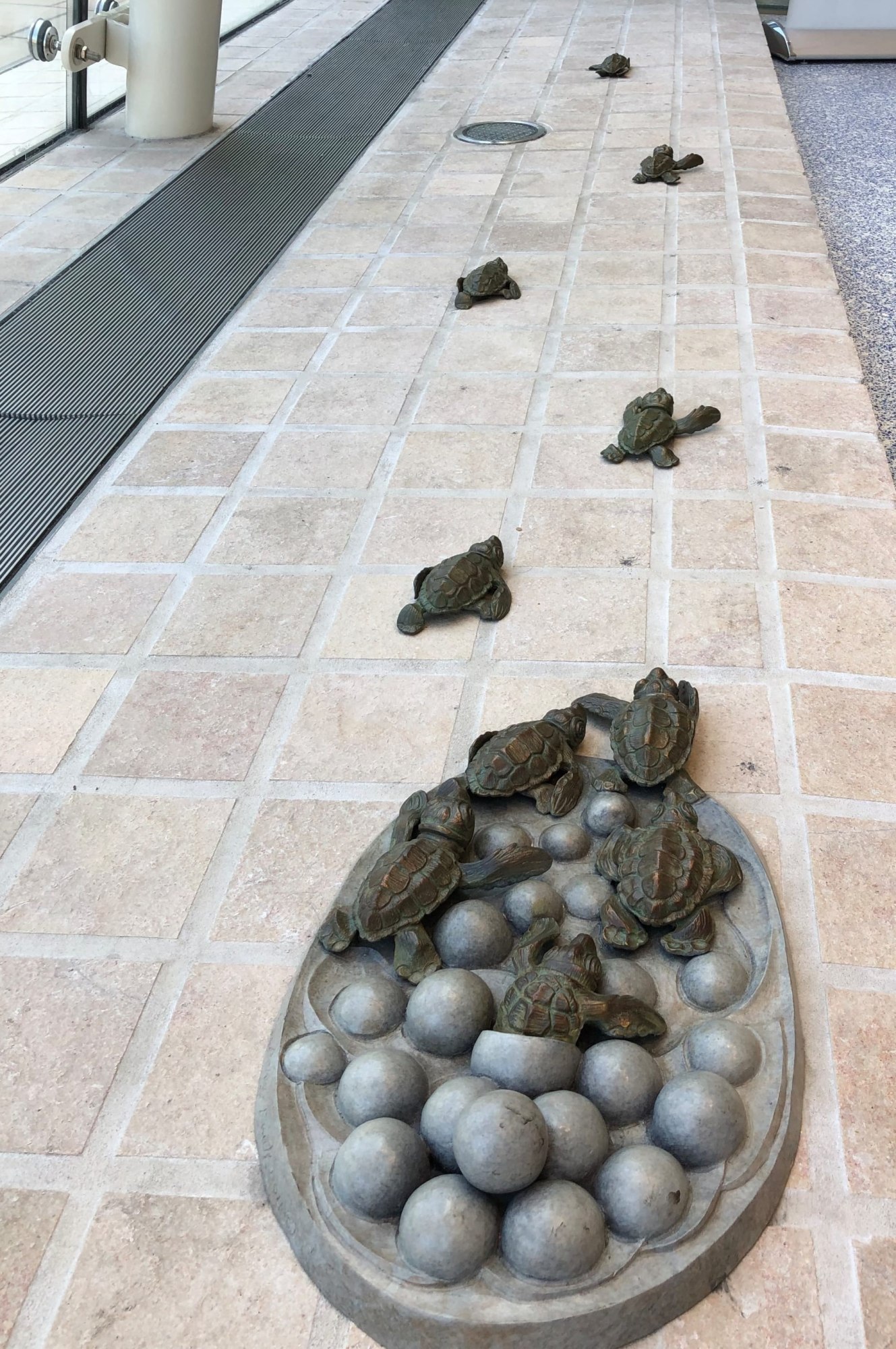 Pokey Park, Down to the Sea, 2017, bronze and marble, 3 x 19 x 12 inches, Lucile Packard Children’s Hospital at Stanford, Main. This installation conveys a complete scene of sea turtles hatching from a pile of carved grey marble eggs. Forming the main section, there are four baby turtles attached to a marble base. There are five more individual baby turtles, spaced across the floor as though scurrying away from the nest.