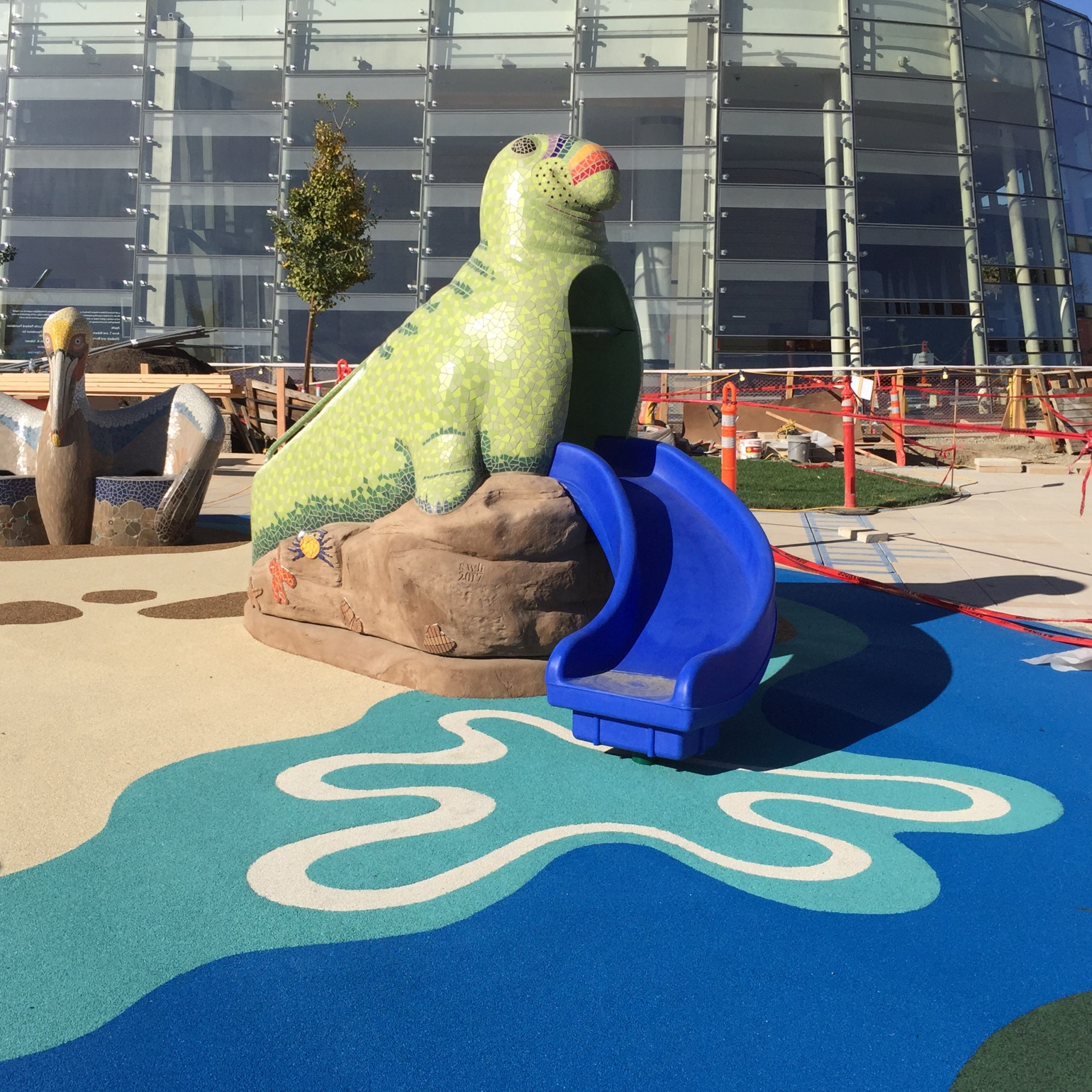Sherri Warner Hunter, Elephant Seal Slide, c.2017, glazed ceramic tile pieces, glass reinforced plastic (GFRP), glass reinforced concrete (GFRC), expanded polystyrene foam plank (HDF), paint, glass, and steel, 95 x 85 x 60 inches, Lucile Packard Children's Hospital at Stanford, Main. A green mosaic elephant seal standing on a rock with a staircase in its back up to an archway that leads to a blue slide. There are patches of colorful glass and ceramic tile designs in the rock.