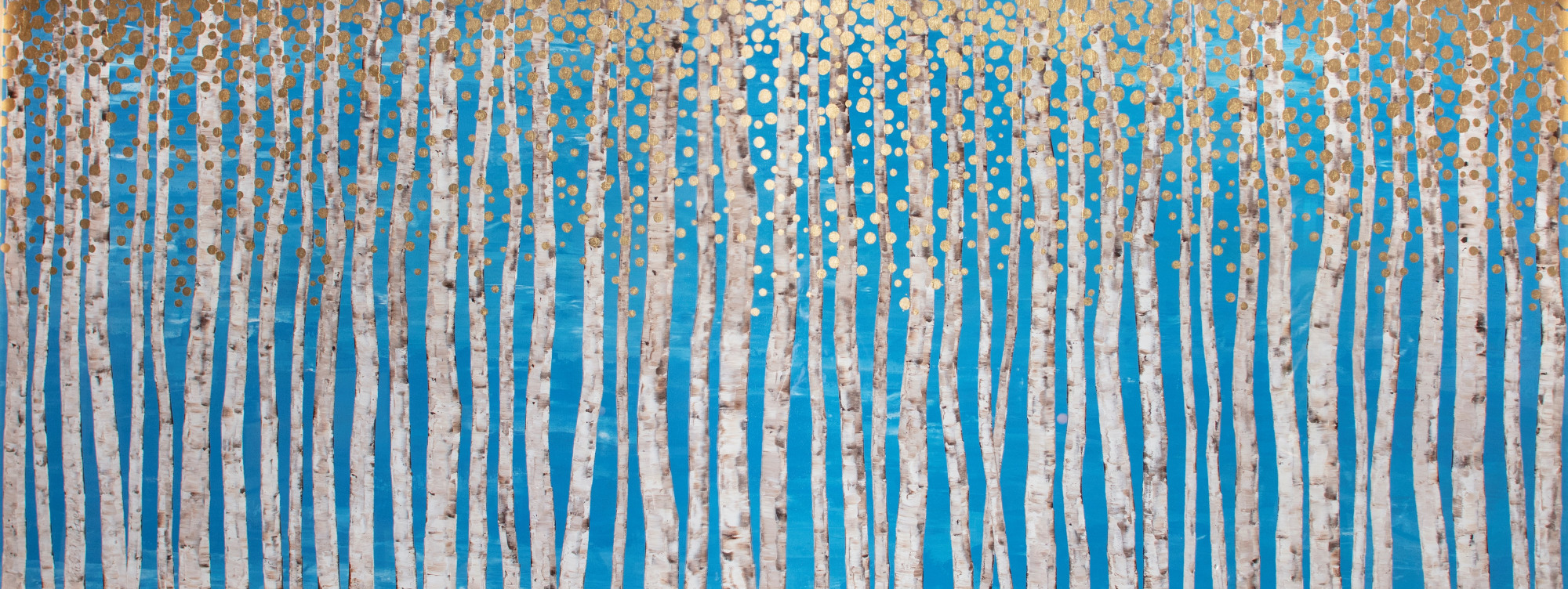 Kate Salenfriend, For Love 4285, oil paint and gold leaf on canvas, 48 x 60 inches, Lucile Packard Children's Hospital at Stanford, Executive Suite at 700 Welch. Donated by Bruce and Elizabeth Dunlevie. "For Love 4285" is a slightly denser grove of Aspen trees as compared to Packard's other commission by Kate Salenfriend. Both feature gold leaf applications and a thick application of paint and glazes typical for the artist.