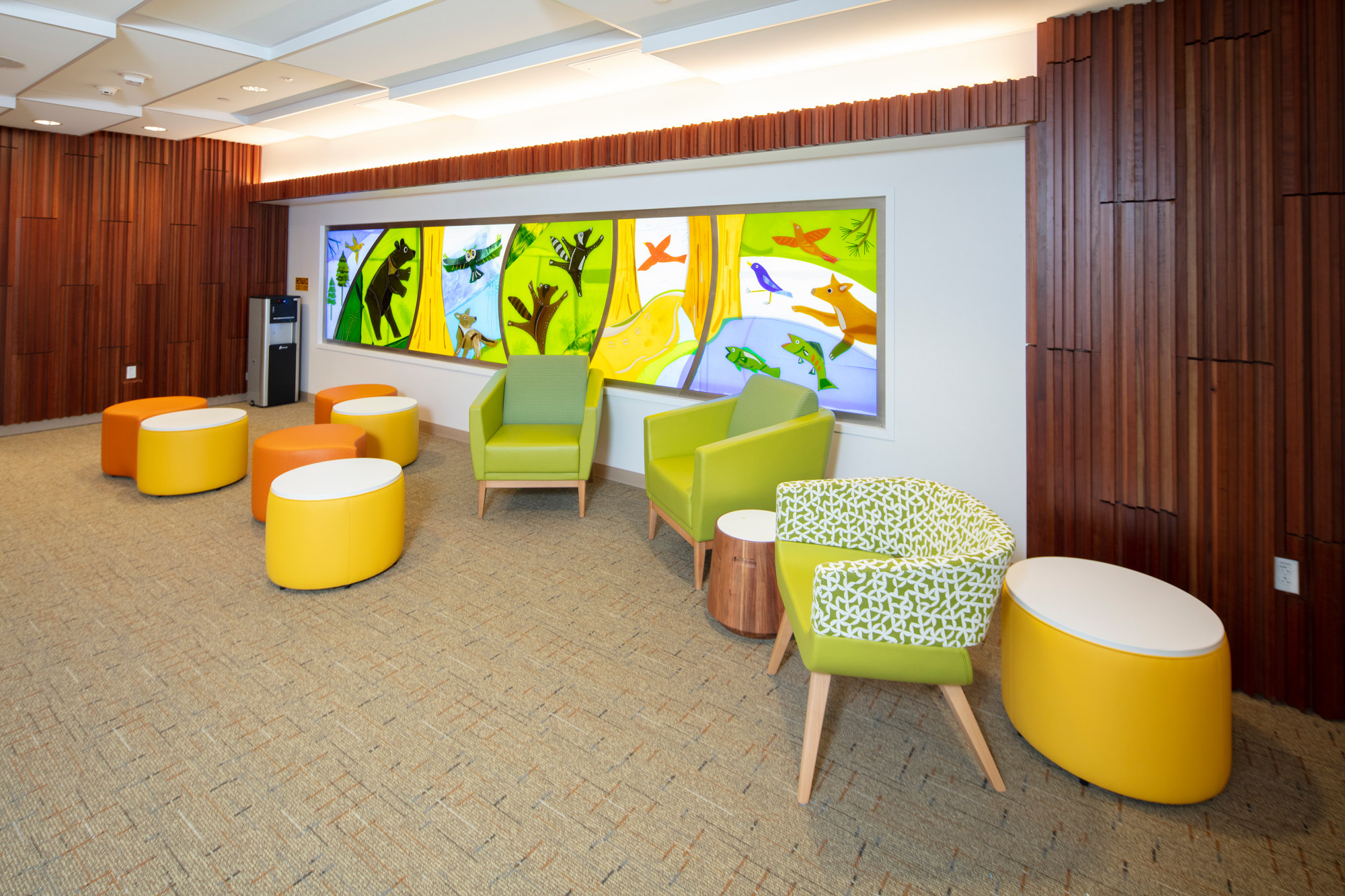 Shawn Trentlage and Darcy Ferrill, Forest Dance (1 of 2 walls), 2019, glass with metal at panel edges, 48 x 252 inches, Lucile Packard Children’s Hospital at Stanford, Main. This mural is back-lit and consists of seven sections of fused colored glass, showcasing animals in a forest landscape with a river prominently featured.