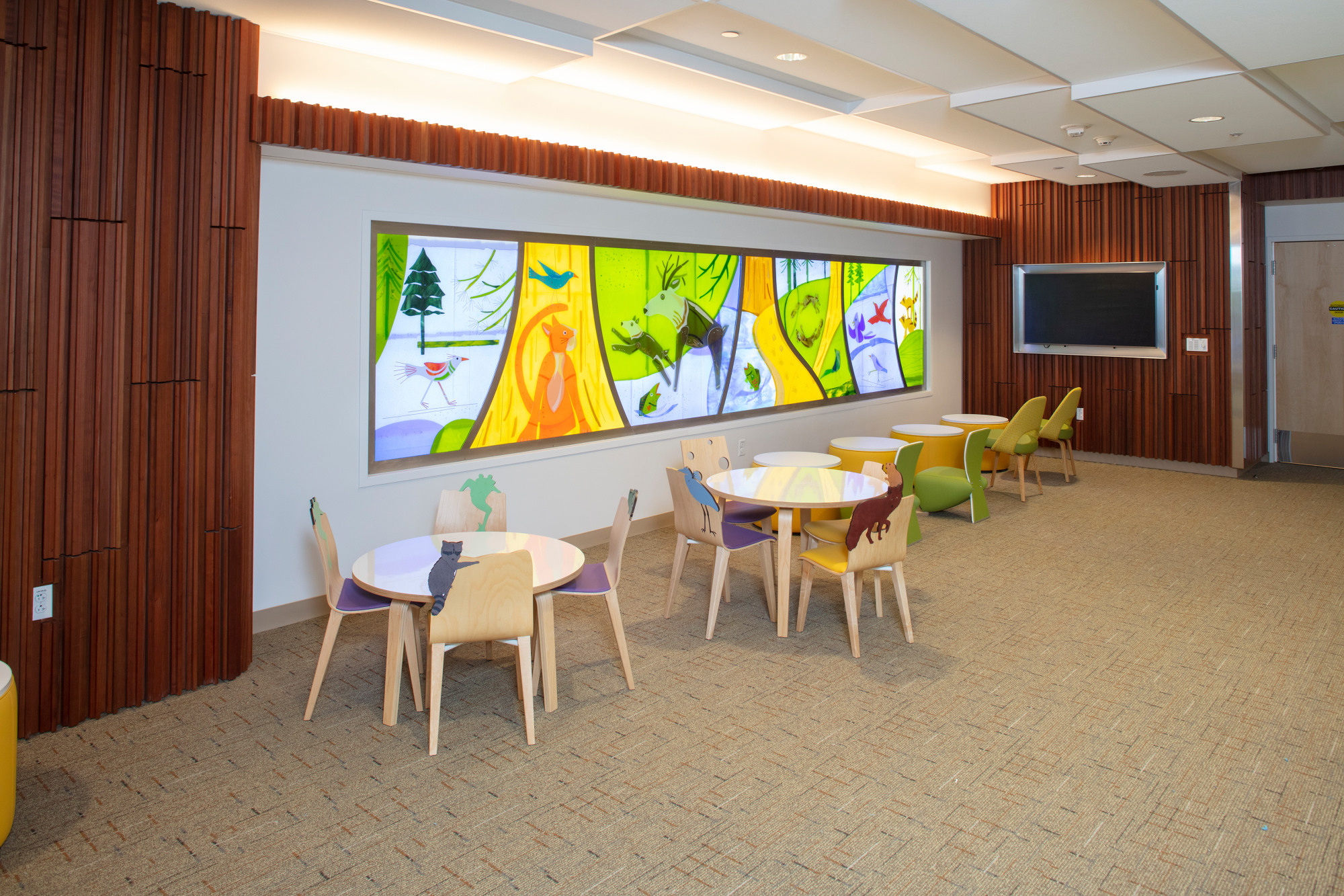 Shawn Trentlage and Darcy Ferrill, Forest Dance (1 of 2 walls), 2019, glass with metal at panel edges, 48 x 252 inches, Lucile Packard Children’s Hospital at Stanford, Main. This mural is back-lit and consists of seven sections of fused colored glass, showcasing animals in a forest landscape with a river prominently featured.