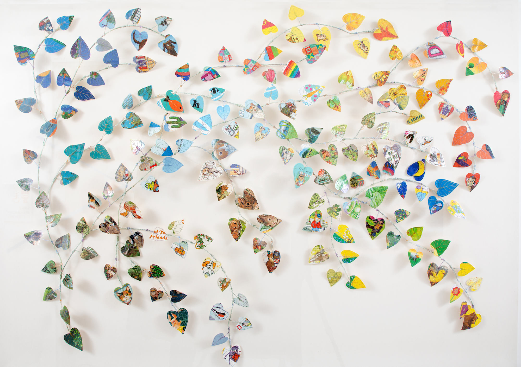 Lisa Kokin, Friends, 2023, paperback children's books, thread, wire, and mull fabric, 46 x 63 x 3.5 inches, Lucile Packard Children's Hospital at Stanford, West. The leaves are made from children’s book illustrations, and you might just find one of your favorite animals pictured.