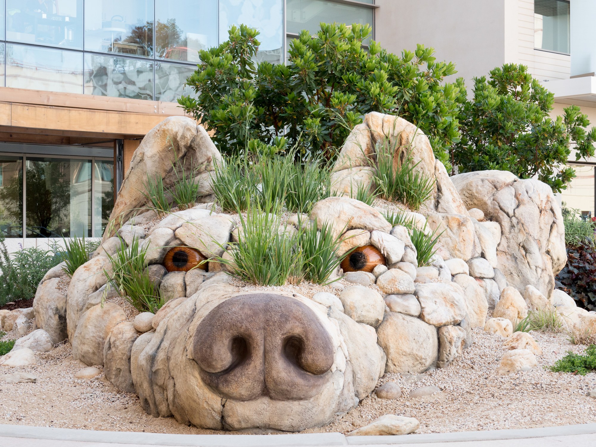Michael Green, Gray Wolf, 2017, glass reinforced concrete (GFRC), polystyrene foam sheets (ESP) foam, paint, rock, plastic, plants, 60 x 142 x 136 inches, Lucile Packard Children’s Hospital at Stanford, Dunlevie Garden. Constructed out of faux boulders, this sculpture of a large wolf head is fully integrated into the surrounding landscape, complete with patches of live grass fur.