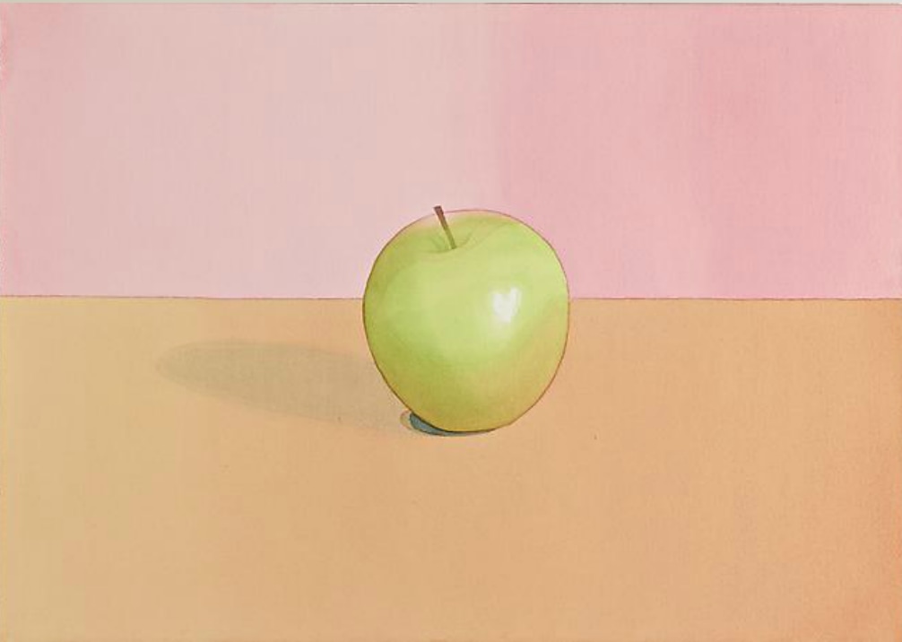 Mark Adams, Green Apple, 1978, watercolor, graphite, on paper, 14 x 20 inches, Lucile Packard Children's Hospital at Stanford, Main. Donated by the Adams & Van Hoesen-Adams Trust. Watercolor of a bright green apple placed on a table in front of a pink wall. The position of the table against the wall splits the composition almost perfectly in half.