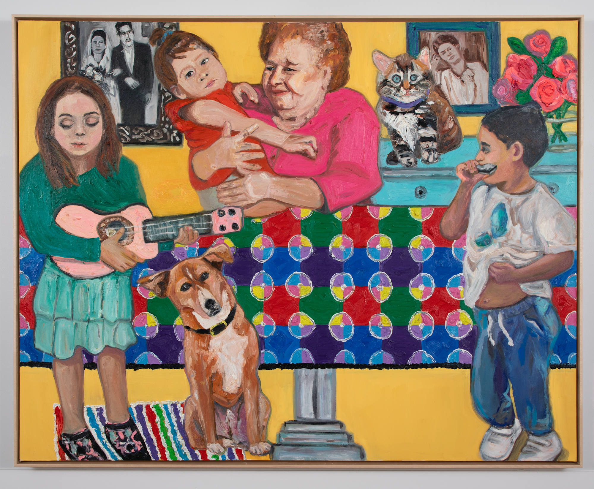 Jessica Alazraki, Guitarist in Pink, 2024, oil on canvas, 48 x 60 inches, Lucile Packard Children's Hospital at Stanford, West. A Latina grandmother, holding one of her grandchildren, listens intently to a concert put on by her other two grandchildren.