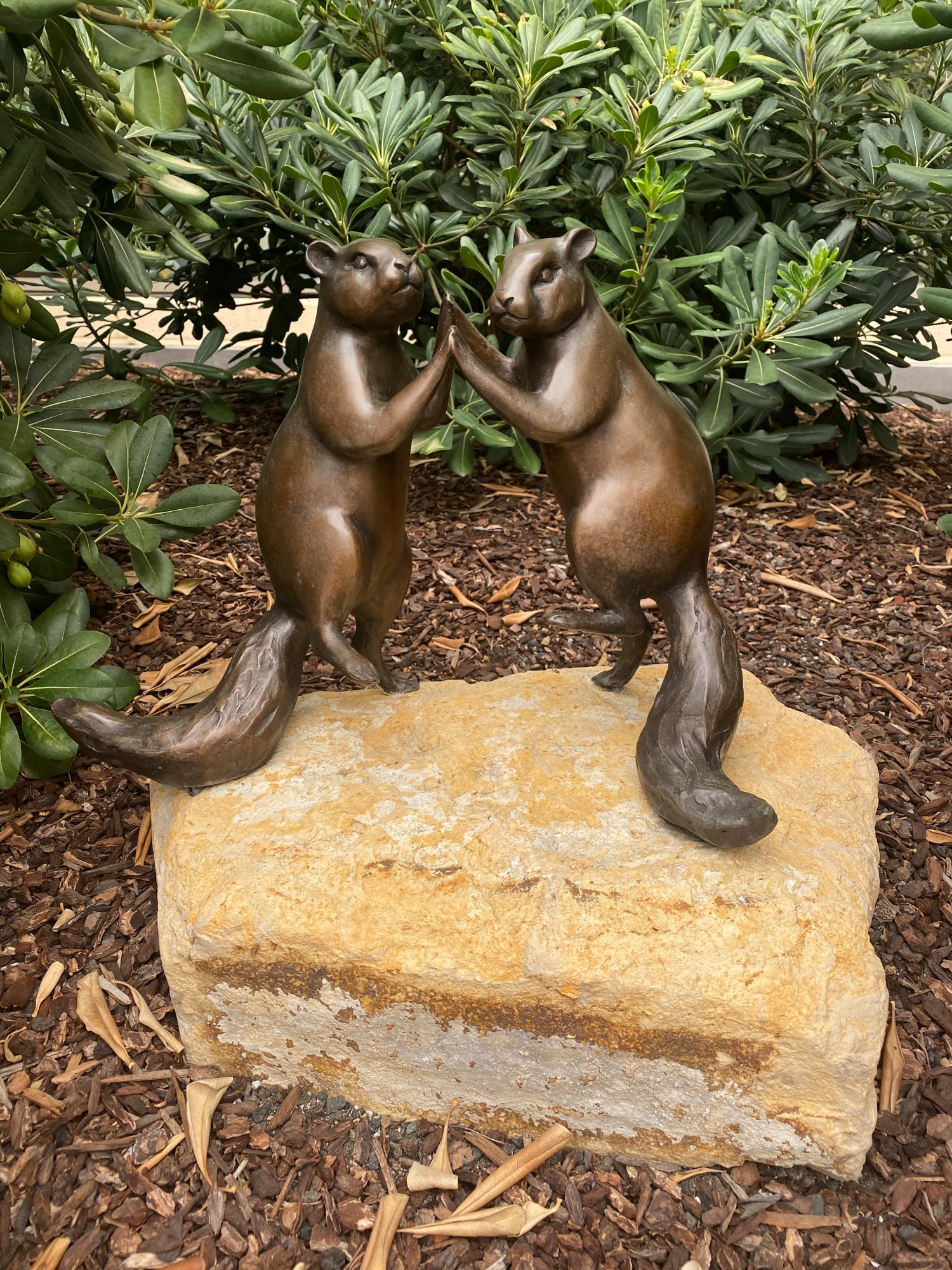 Georgia Gerber, Hidden Animals: Harvest Dance Squirrels, c.2017, bronze, patina, and wax, 16 x 18 x 13 inches, Lucile Packard Children’s Hospital at Stanford, Main. Two cast bronze upright squirrels joined at hands, dancing.