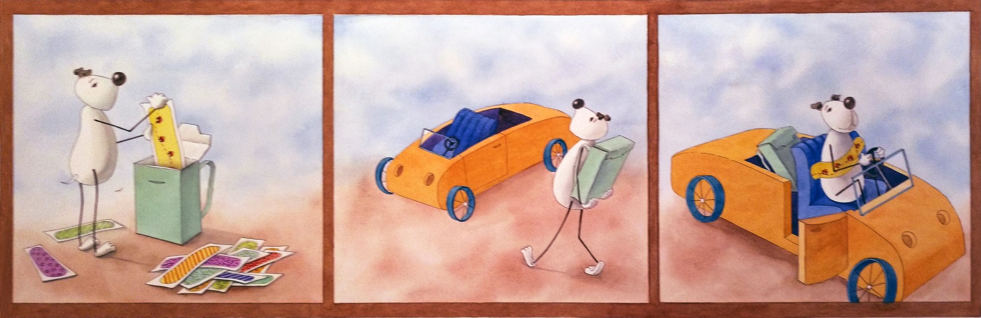 Victoria Neyman, I am only ready for my trip when my seat belt attached and fit, c.2017, watercolor on paper, 16 x 48 inches, Lucile Packard Children's Hospital at Stanford, Main. A three-panel narrative of a small dog preparing for his road trip, from packing his bag to wearing his seatbelt.