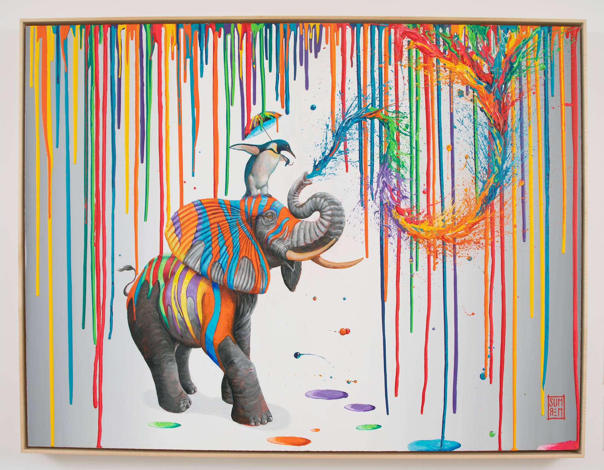 Michael Summers, Joyful, 2024, acrylic on canvas, 36 x 48 inches, Lucile Packard Children's Hospital at Stanford, West. An unlikely pairing of an Emperor Penguin and an African Elephant, playing with paint!