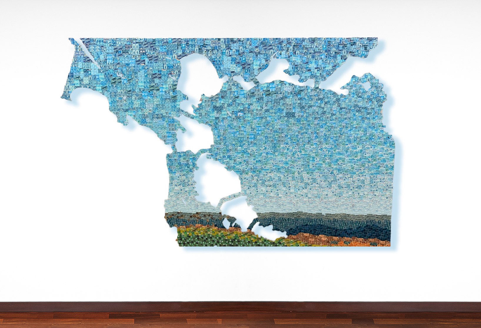 Peter Hite, Landscape Map of Bay Area, 2021, mixed media, 53 x 83 inches, Lucile Packard Children's Hospital at Stanford, Administrative Lobby at 700 Welch. Made of postage stamps, this map of the Bay Area is also meant to represent a landscape with grasses in the foreground and a wide open expanse of sky above.