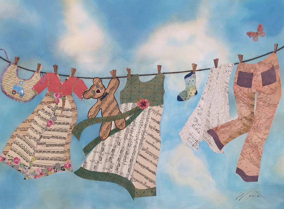 Marion Wood, Line Dance, c.2017, oil with paper collage on canvas, 30 x 40 inches, Lucile Packard Children's Hospital at Stanford, Main. Clothing made out of sheet music is moved by the breeze and appears to dances on a clothesline.