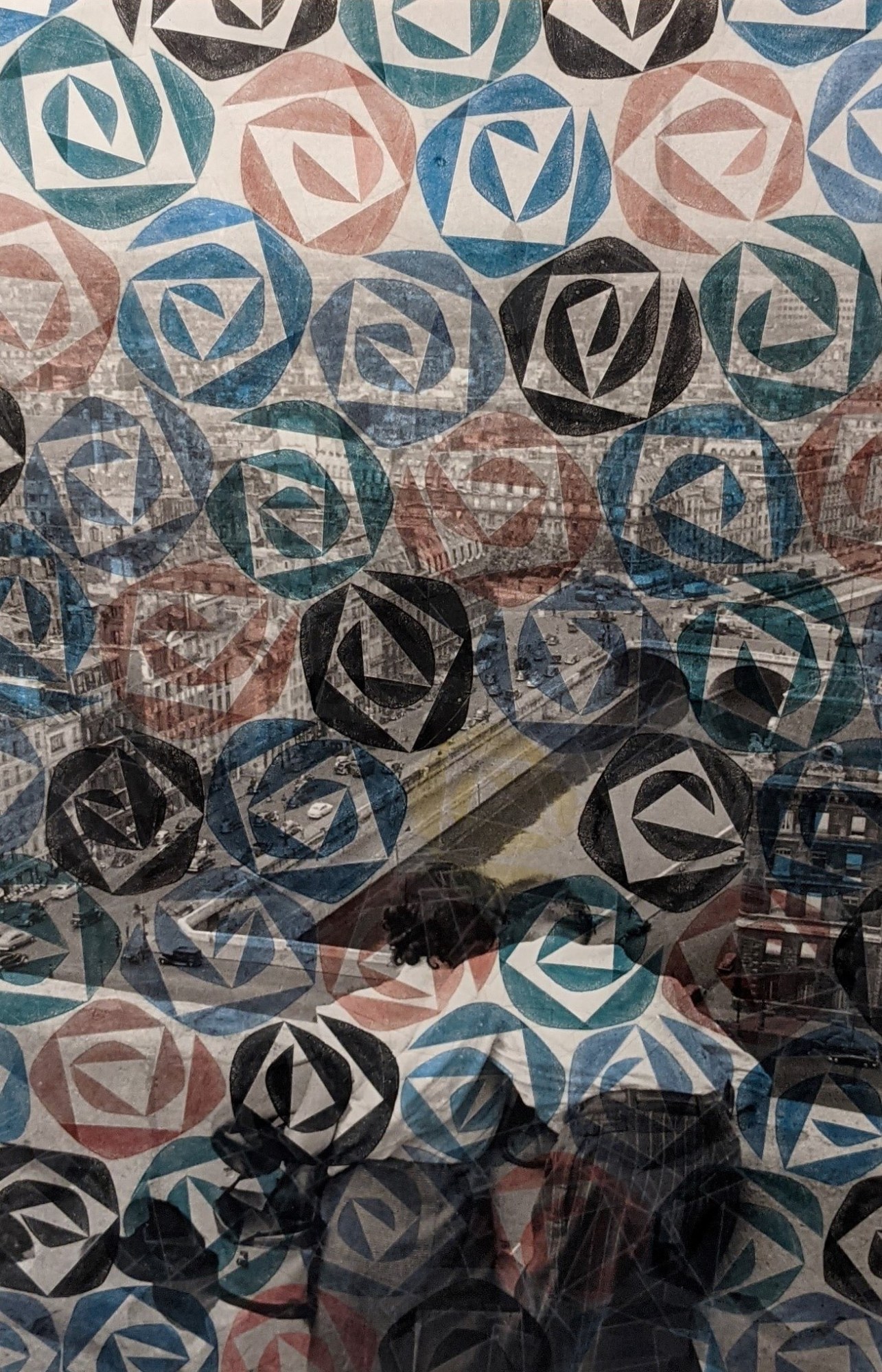 Paul Laster, Little Pleasures, 1989, mixed media on paper, 21 x 14 inches, Packard Children's Hospital at Stanford, Executive Suite at 700 Welch. Donated by the Mary Patricia Pence Revocable Trust. Paul Laster layers colored tape transparencies over modernist photographs to create layers of meaning. The original image is by Henri Cartier-Bresson, and the title is from Wassily Kandinsky.