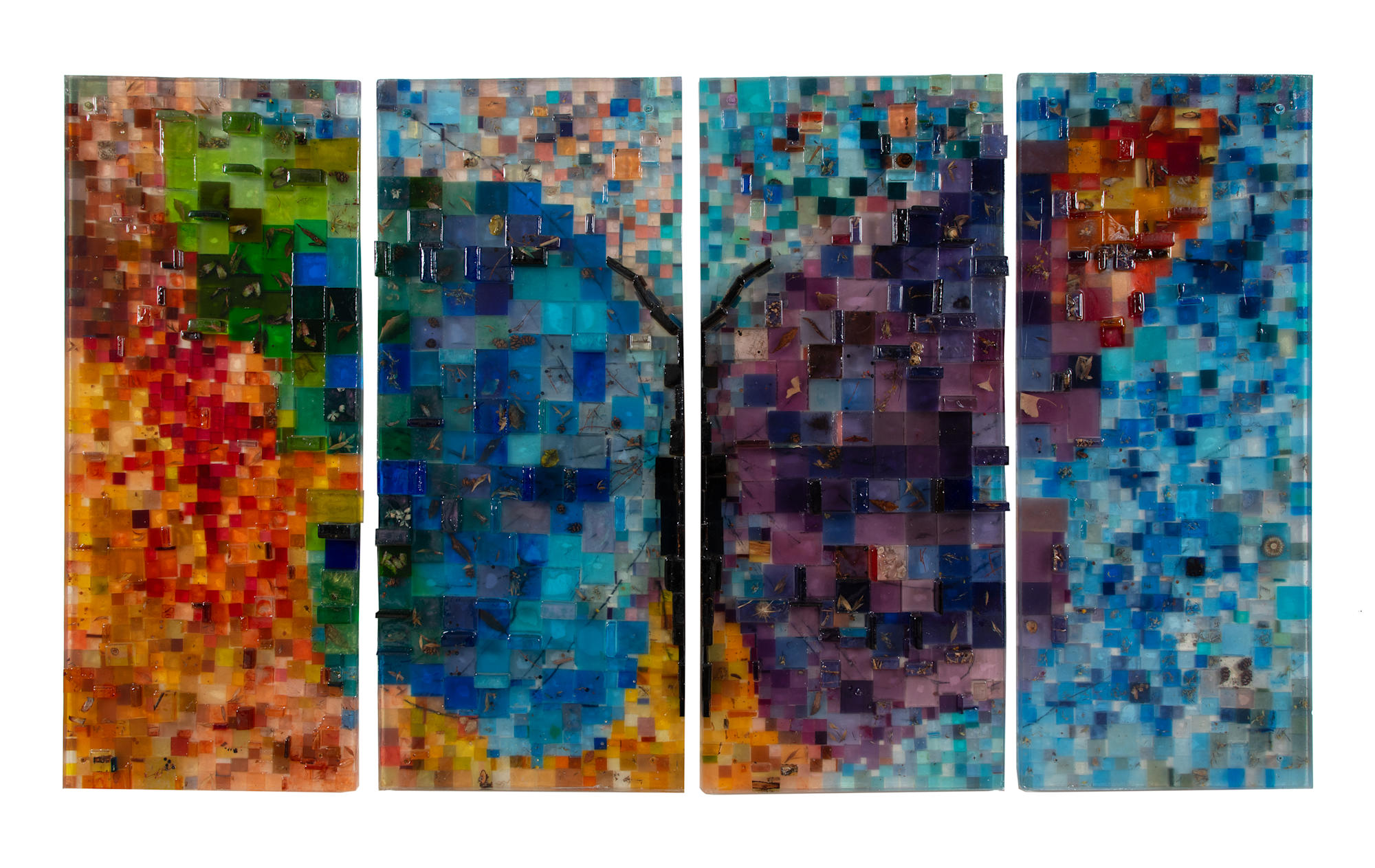 Teresa Camozzi, Metamorphosis, 2024, resin and plant/animal material, 42 x 72 inches, Lucile Packard Children's Hospital at Stanford, West. An enormous butterfly shape serves as the infrastructure for many tiny resin cubes, each containing an insect or natural element for additional visual enjoyment.
