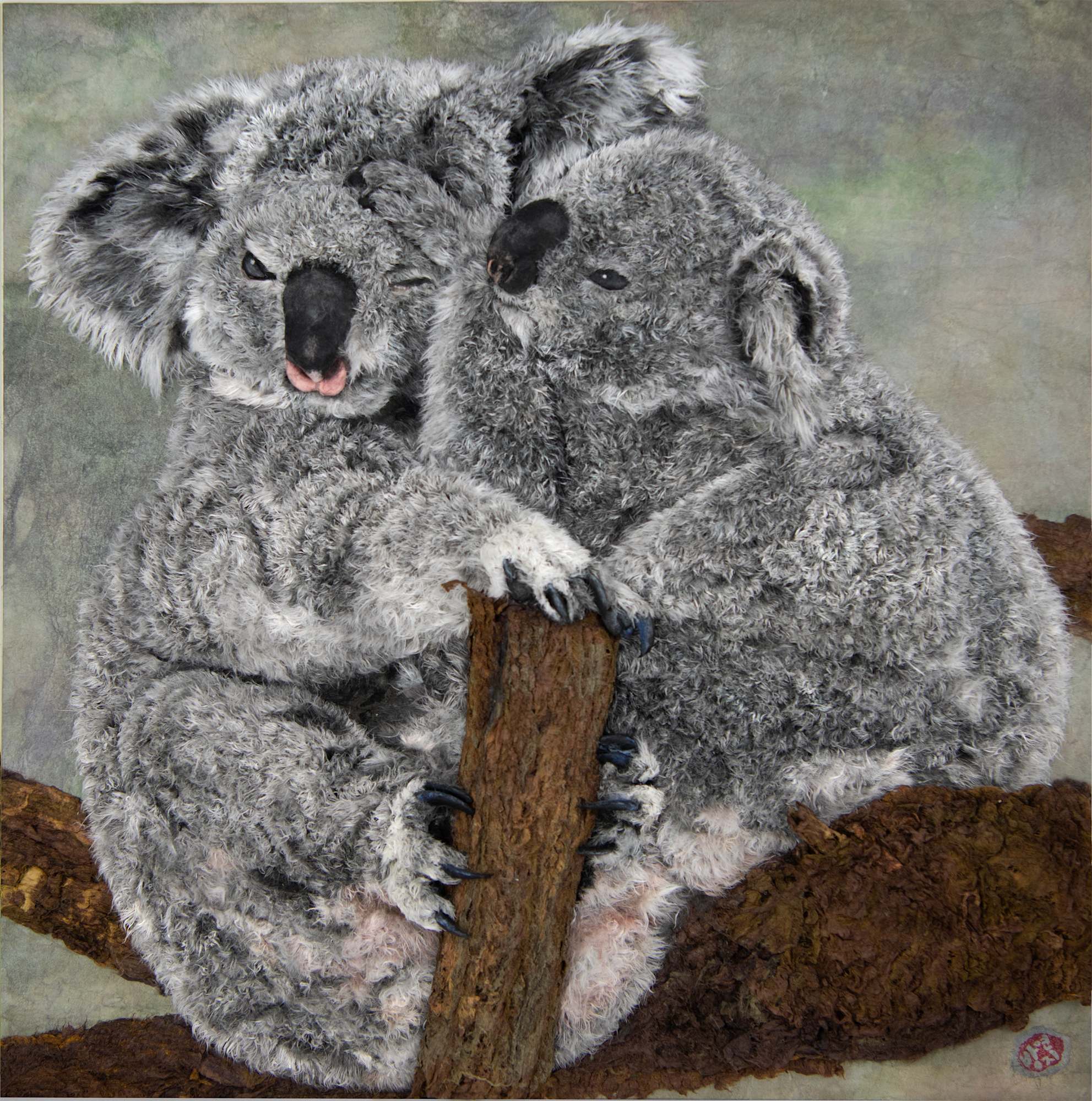 Yun Gee Bradley, Mother's Love, 2024, Hand-dyed Mulberry Bark and Paper, 16 x 16 inches, Lucile Packard Children's Hospital at Stanford, West. A koala mama and baby in a tree.