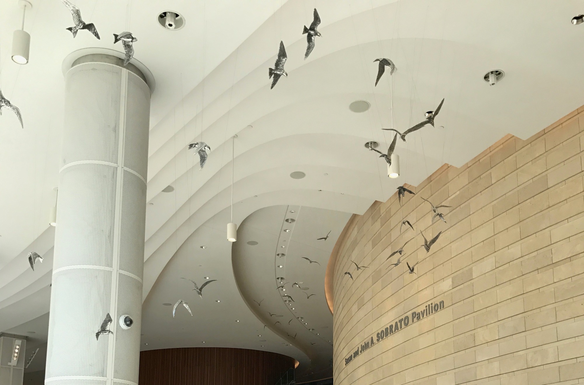 One hundred polished flying birds suspended from the ceiling on welded airplane cable. The number of birds represents Lucile Packard’s 100th birthday in 2014.