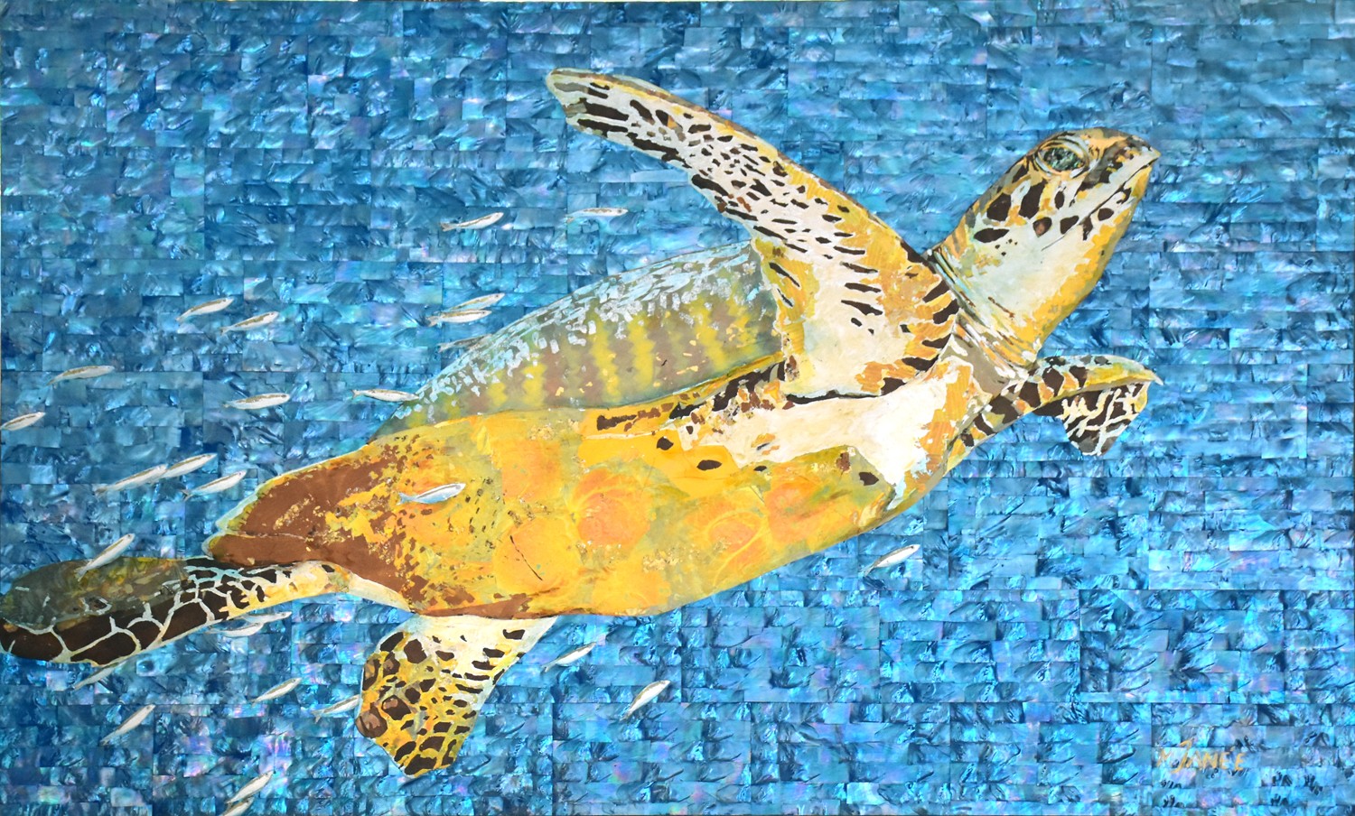 Michelle Janee, Soaring the Turquoise Sea, c. 2017, shell veneer and gold leaf, 40 x 64 inches, Lucile Packard Children's Hospital at Stanford, Main. A sea turtle swimming in a sparling sea of turquoise.