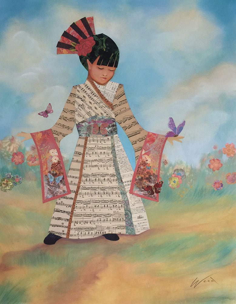 Marion Wood, Spread Your Wings, c.2017, oil with paper collage on canvas, 40 x 30 inches, Lucile Packard Children's Hospital at Stanford, Main. A girl shows off her beautiful kimono with musical notes.