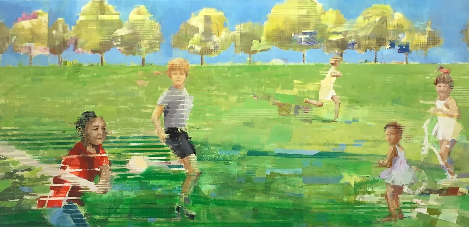 Michael Azgour, Summer at the Park, c. 2017, oil on canvas, 39 x 80 inches, Lucile Packard Children's Hospital at Stanford, Main. Thickly applied oil paint showing children playing in a park.