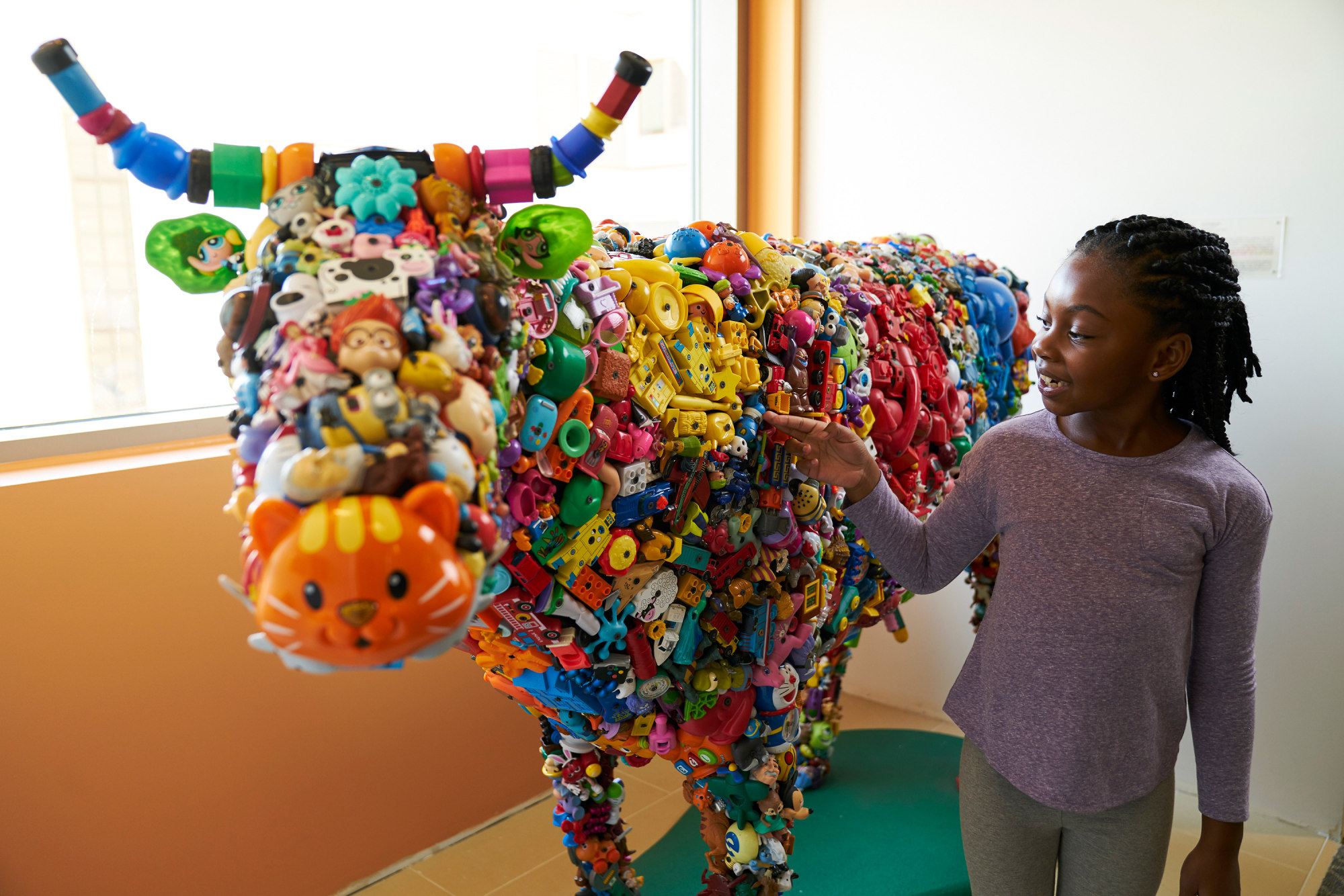 Donald Gialanella, Toy Cow, 2017, plastic toys, wood, steel, and paint, 55.5 x 88 x 32 inches, Lucile Packard Children’s Hospital at Stanford, Main. This cow sculpture is made with toys collected during a hospital staff and Hewlett Packard toy drive. The incorporated toys form color clusters like the spots on a cow.