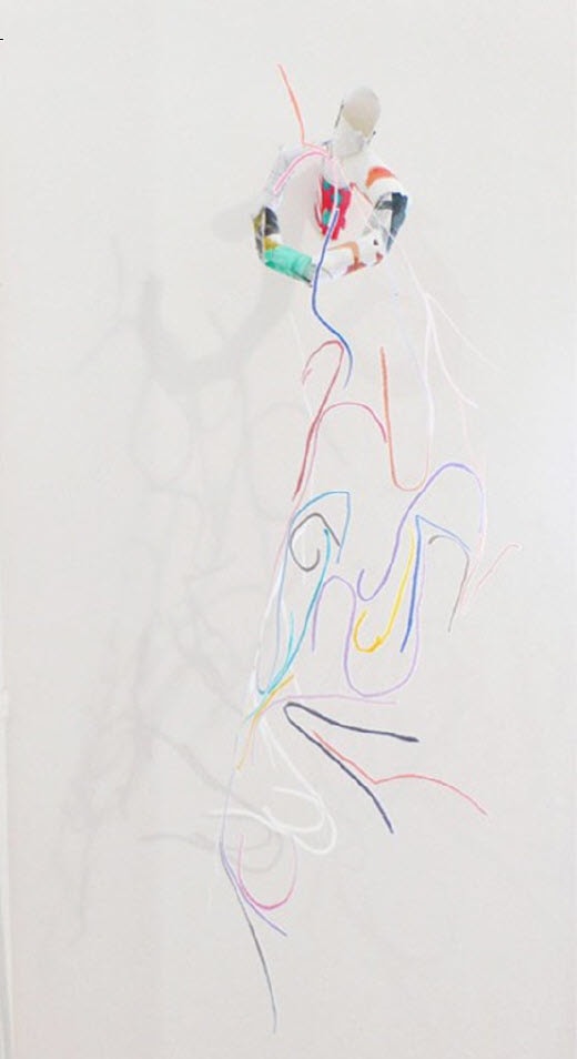 Mark Fox, Untitled, 2010, ink and colored pencil on paper with linen tape, 20 x 9 x 9 inches, Lucile Packard Children's Hospital at Stanford. Donated by the Mary Patricia Pence Revocable Trust. Small wall-mounted paper and linen tape construction. As the artist intended, the strips of paper and linen form shadows on the wall behind.