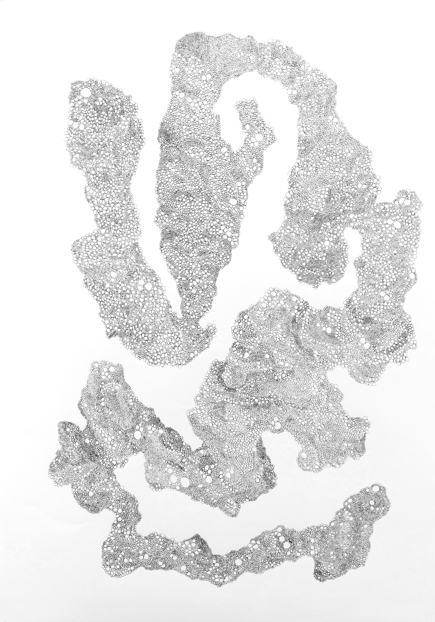 These serial studio drawings are informed by spatial instructions as obstructions, e.g., rotate, expand, shift, merge, branch, pack. The repetitive mark-making became a performance between my body's endurance and the paper, visualized through the pen in my hand moving across the paper surface. Through an organic repetition and expansion of single shapes, new structures and forms are created. The process resembles a Gestalt process. At certain viewing distances, one could even detect discrete forms out of a rather chaotic assemblage.