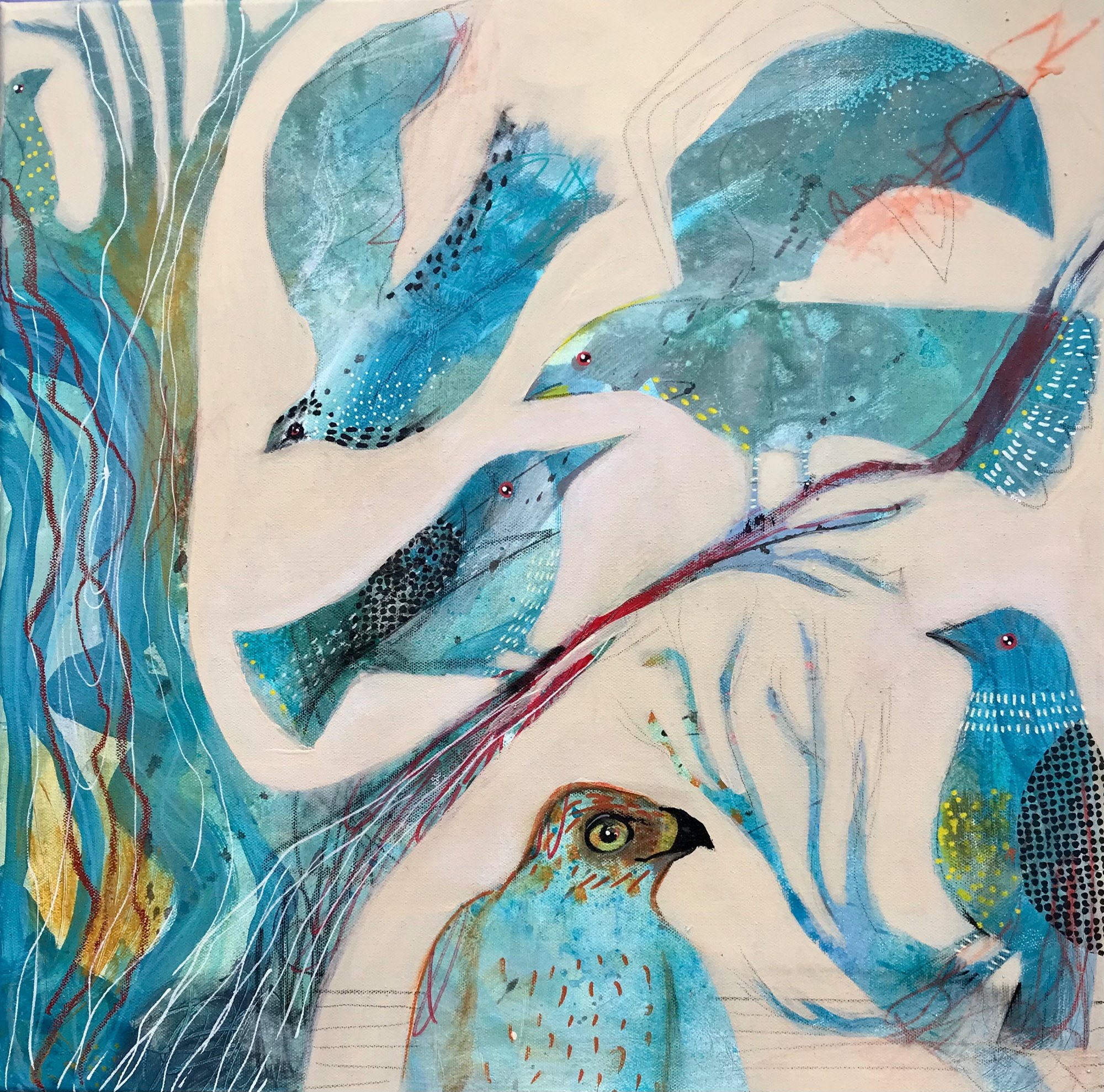 Painted on stretched canvas, framed, ready to hang. Title is based on the poem, The Blue Bird, by Madison Cawein.