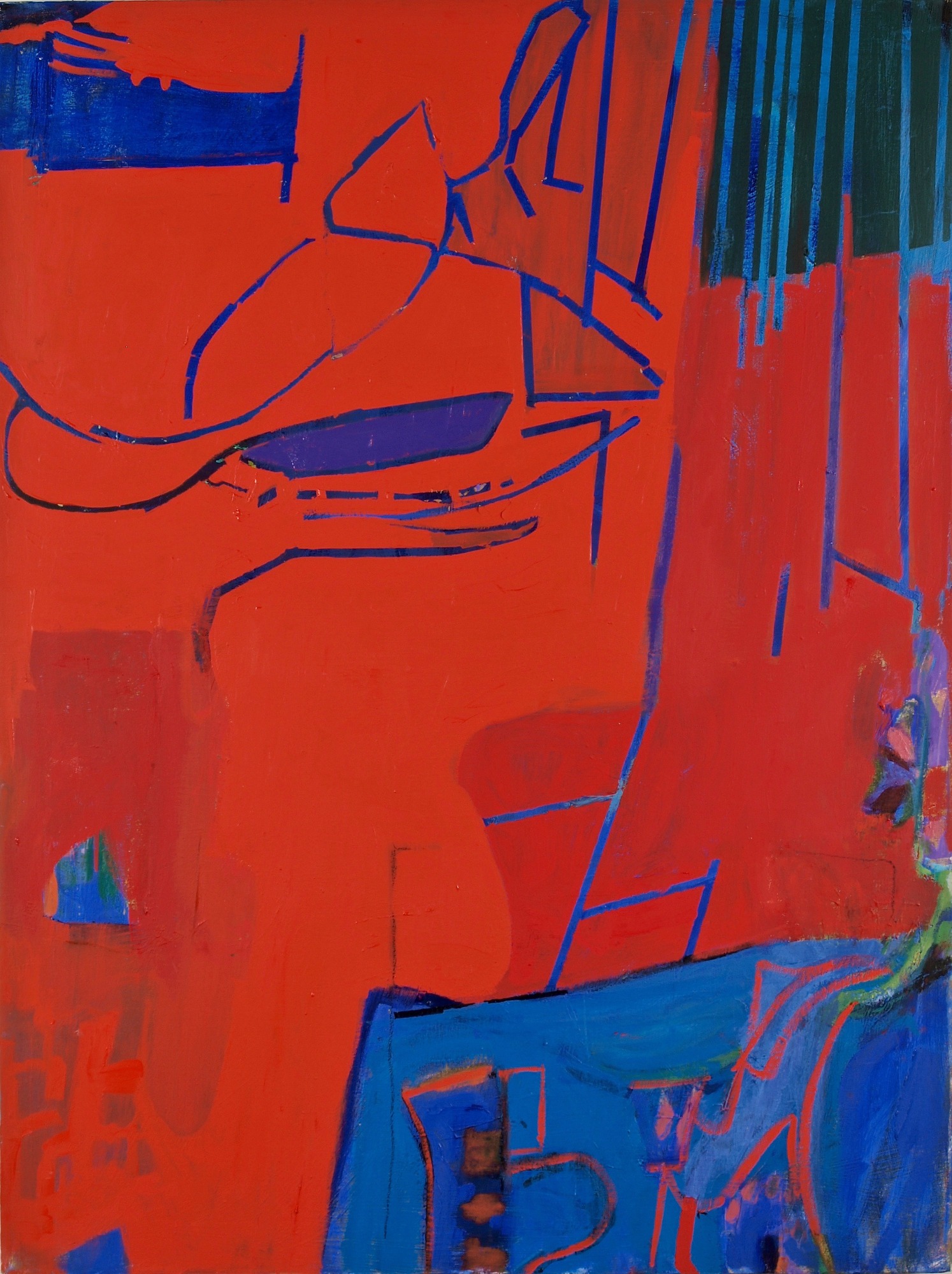 This painting started out very blue. While working on it, I used tape to create a series of linear elements. I painted saturated reds over much of the canvas. When I removed the tape I had a lot of blue lines against a red ground. It was a strategy for bringing more drawing into the painting. There is a sense of a table top in the lower right with objects on it. I like the large bold presence of this painting.