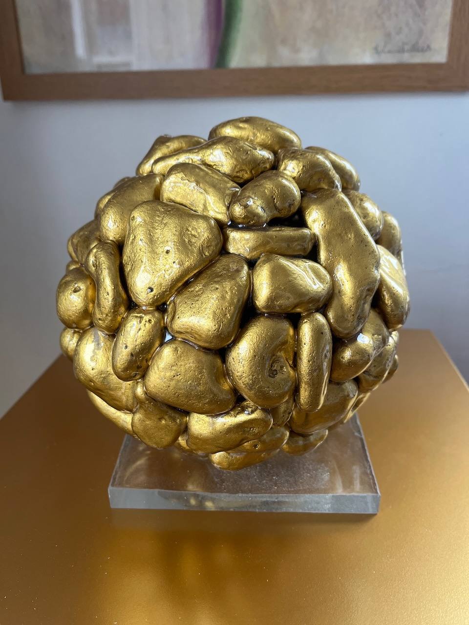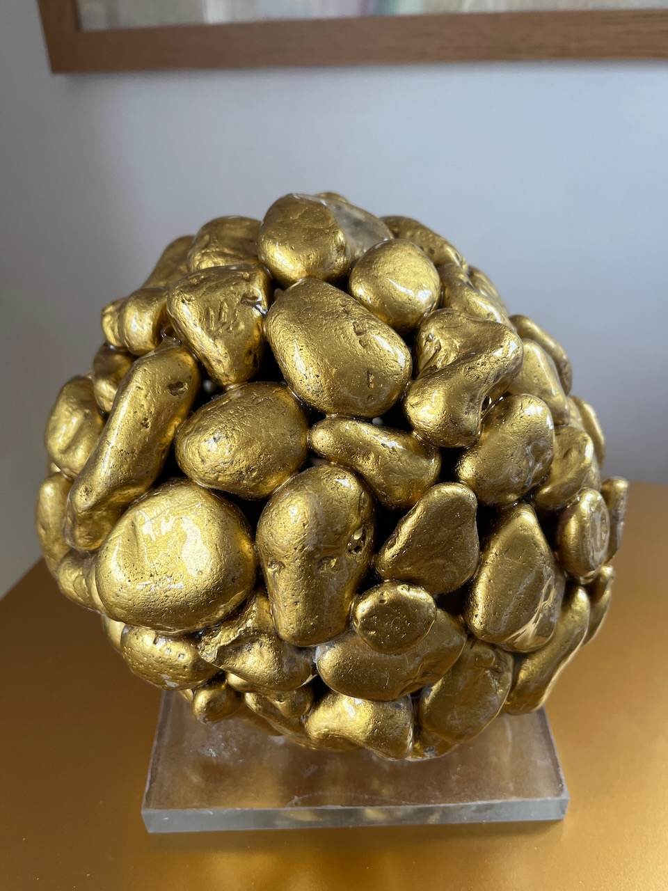River-worn stones, once shaped by water and time, are gathered and veiled in gold — as though a tide of molten sunlight had flowed over them and come to rest.