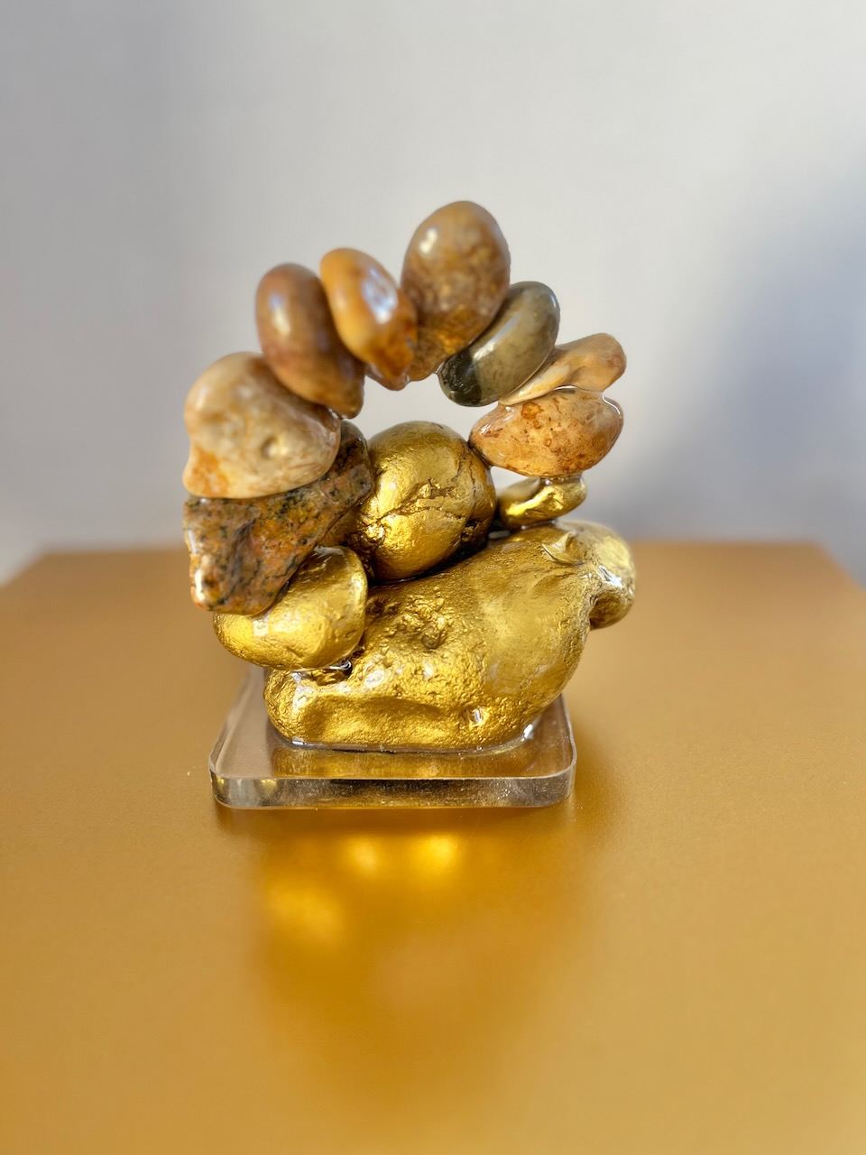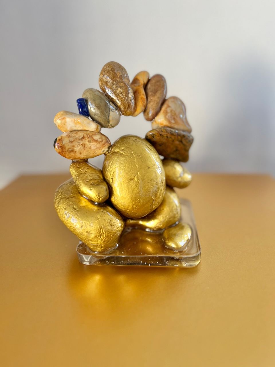 Sea-worn pebbles, lapis lazuli, gold-gilt stones, resin base
