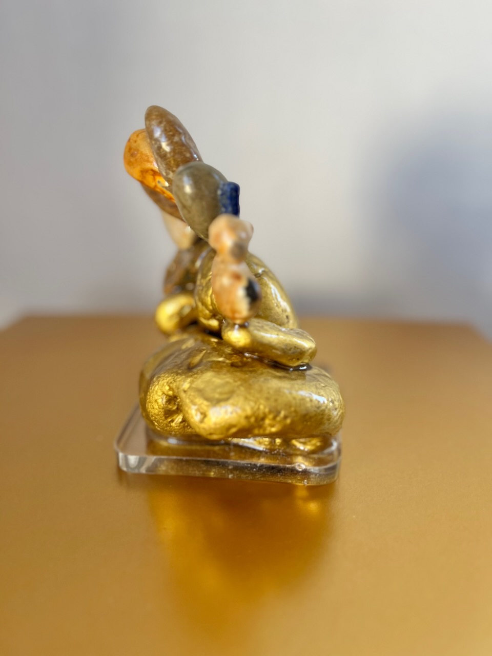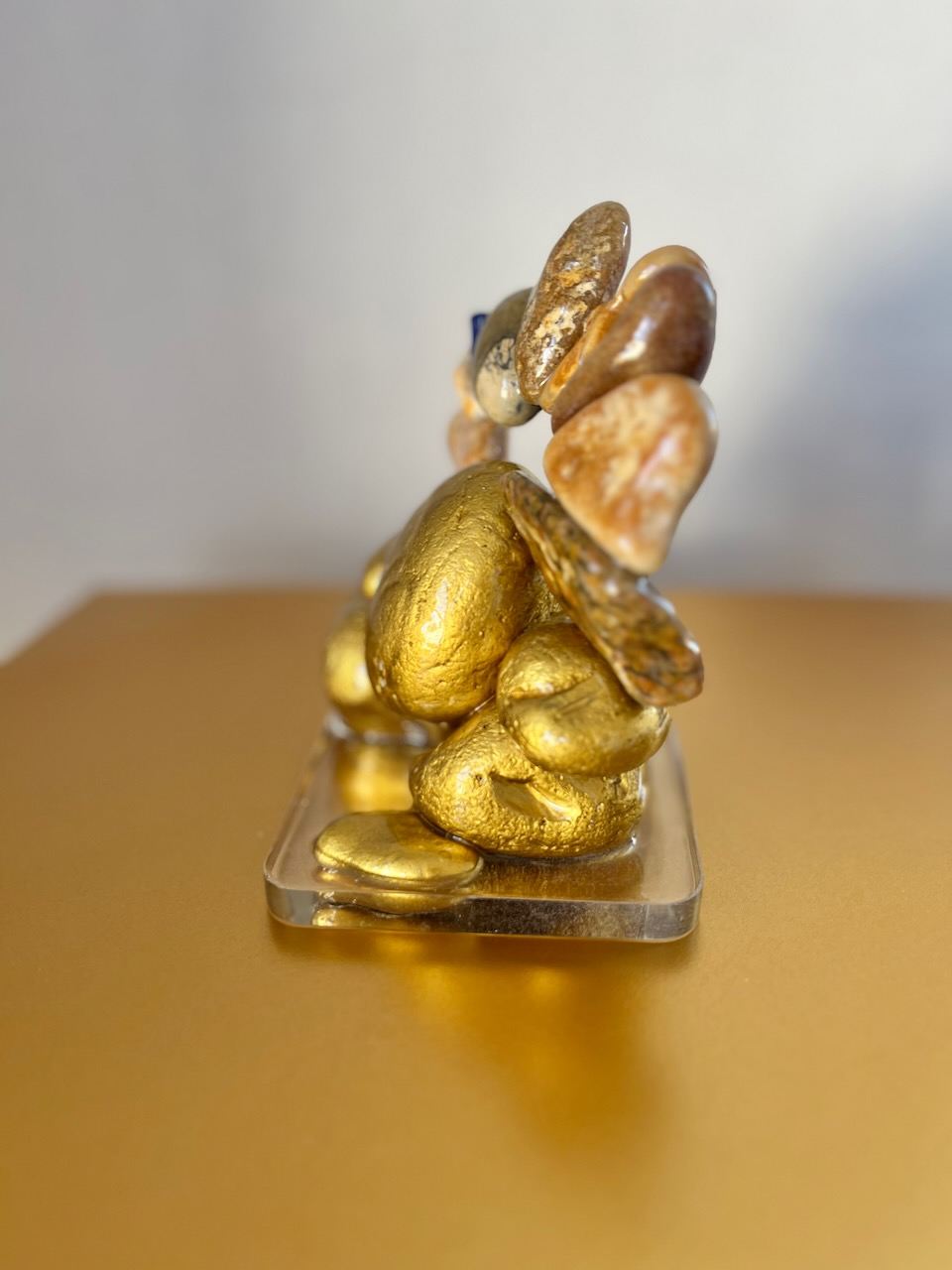 A foundation of gold-gilded stones forms the seat of the sculpture, above which a slender arch of natural pebbles rises, flecked here and there with the deep celestial blue of lapis lazuli.