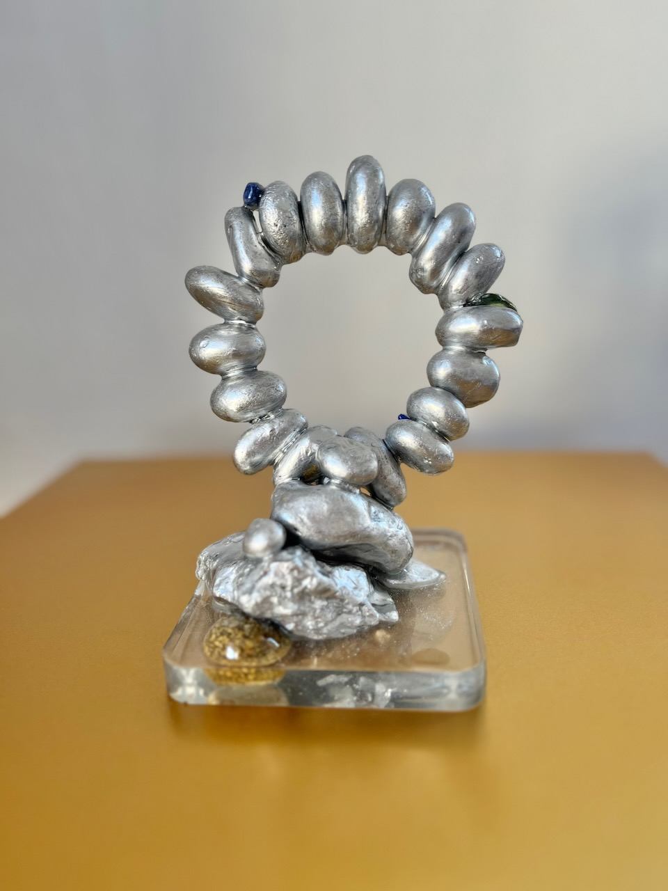 The piece suggests an otherworldly gateway: a ring of orbiting bodies suspended in time, circling a meteorite-like core. The contrast of polished halo and rugged base conjures the mystery of impact, transformation, and the cycles of cosmic creation.