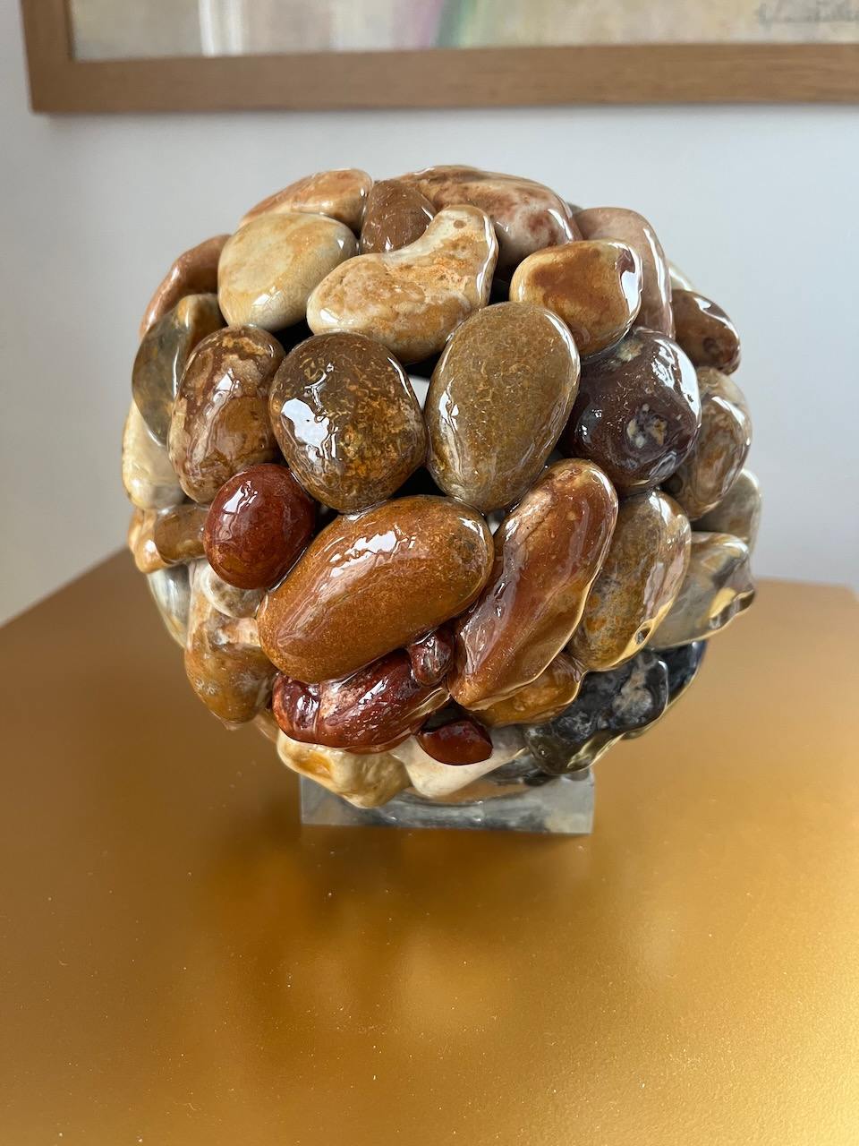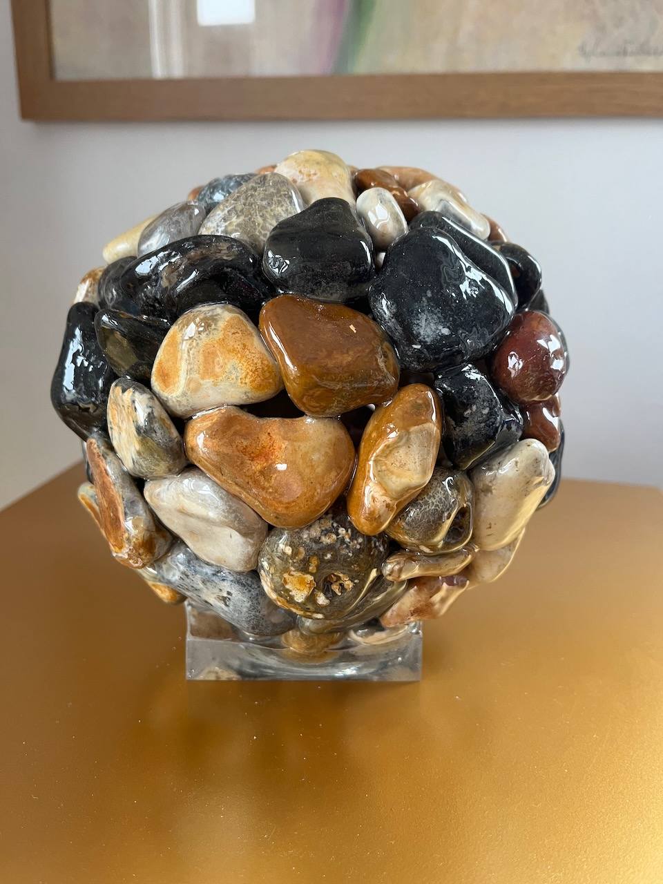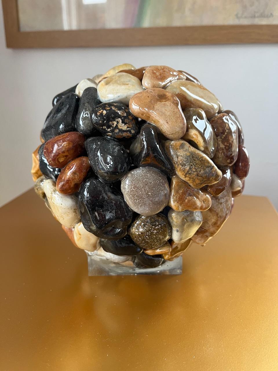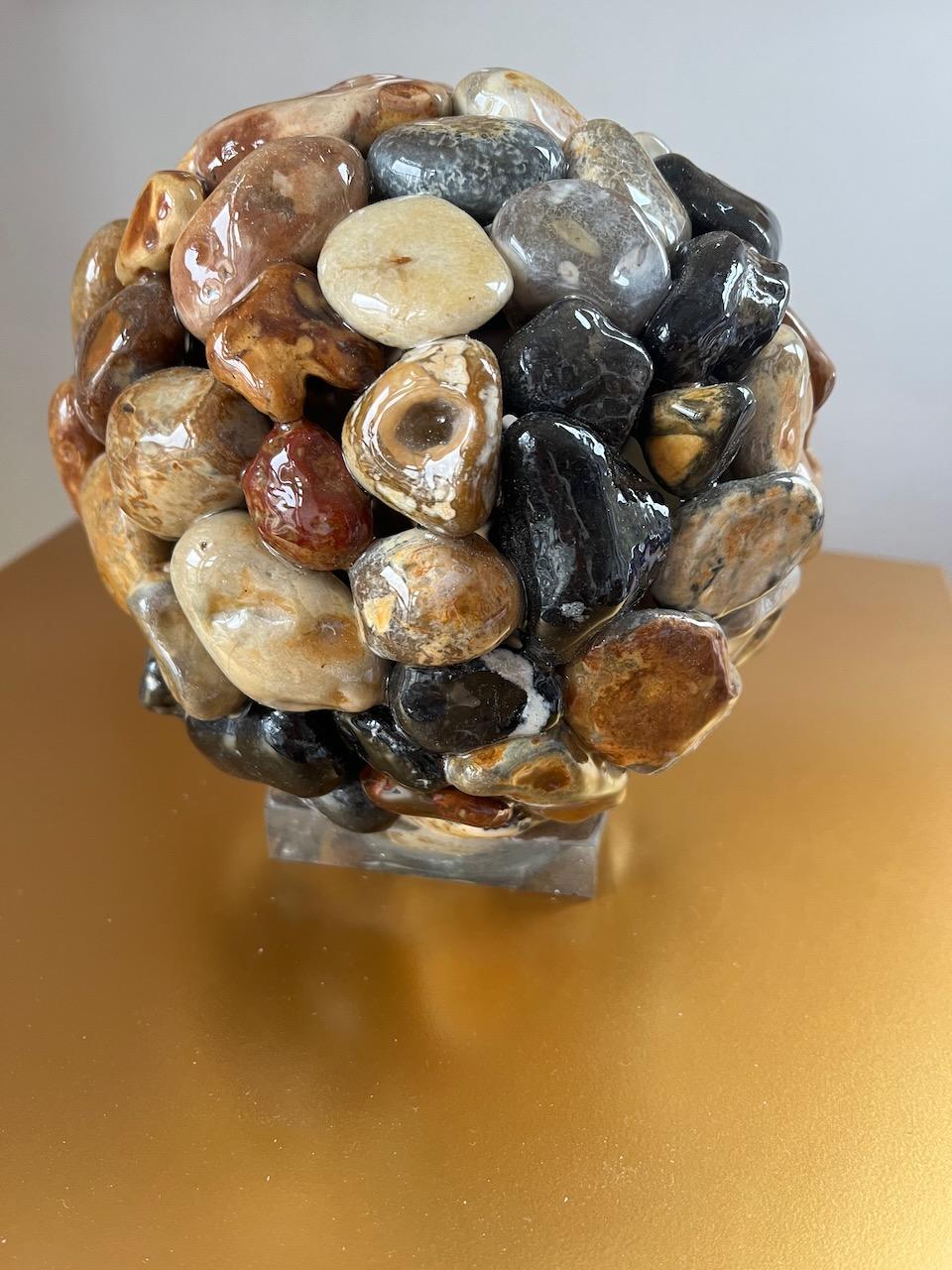 A sphere shaped by time’s own current — rounded pebbles of ochre, rust-red, black, and cream, each smoothed by ancient rivers and bound together in a single timeless form. The surface shimmers as though still wet from the flow, carrying whispers of shorelines, floods, and slow geological turning.
