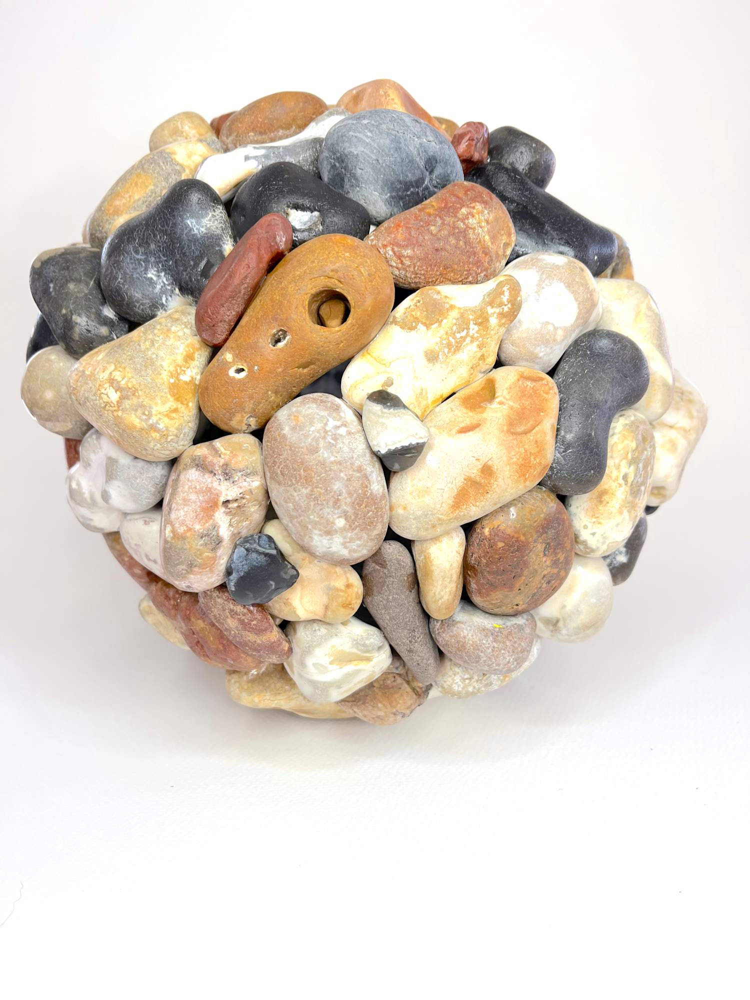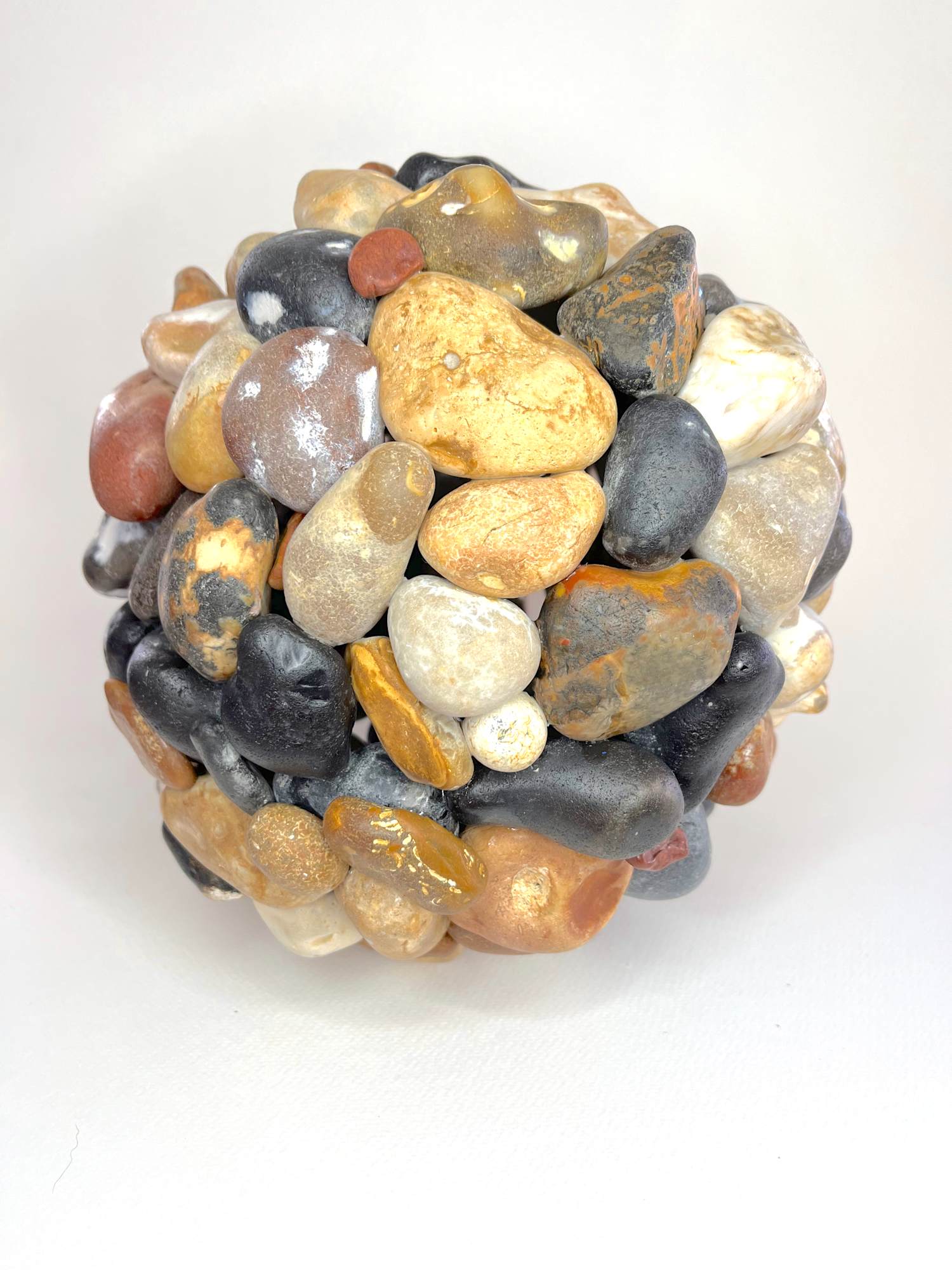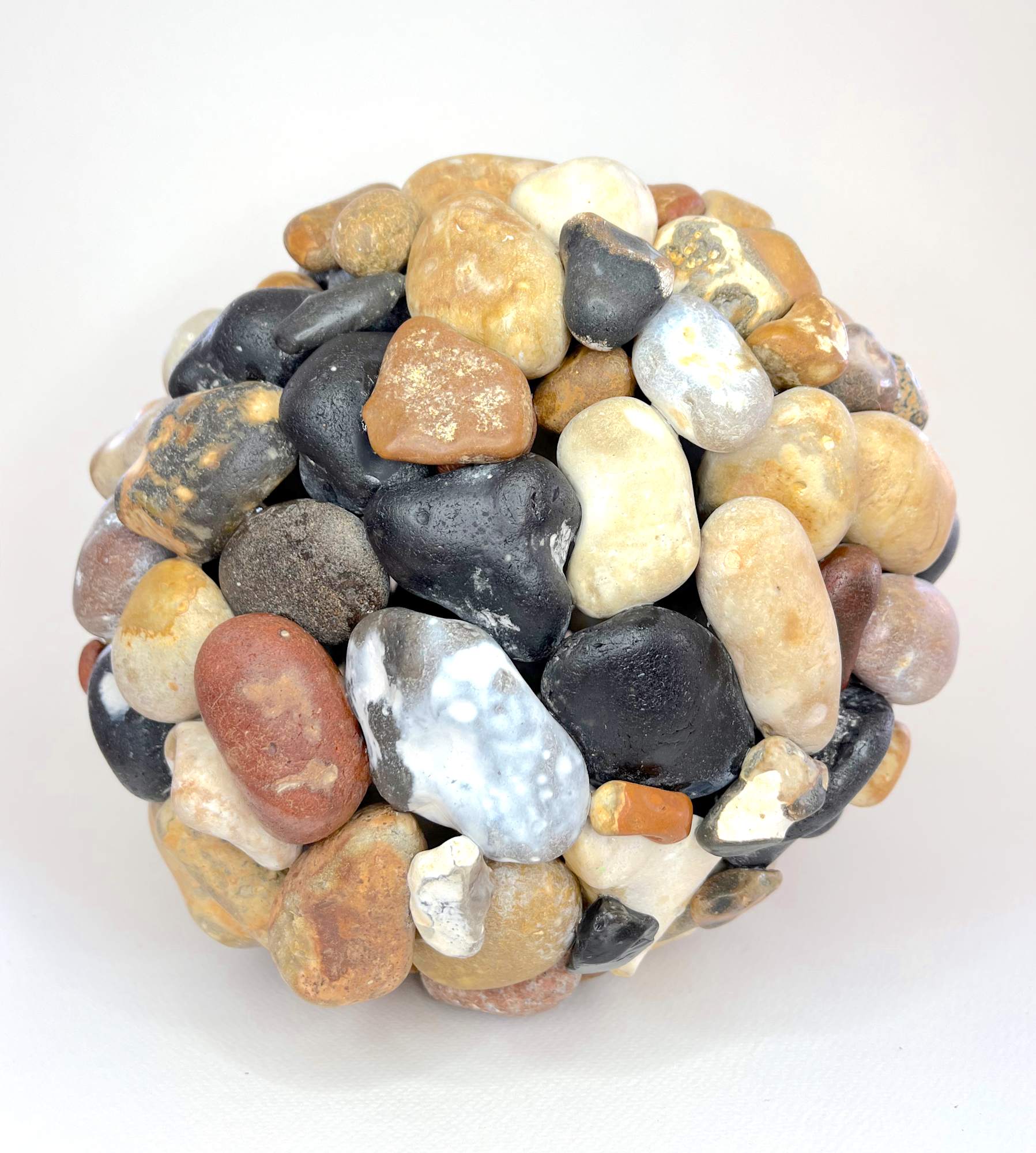 The sphere is composed of a diverse array of stones, including basalt, chert, and jasper, each chosen for their natural beauty and grounding energy. The smooth, rounded shape evokes the strength and nurturing presence of ancient earth and the sacred role of stones in early human civilisations.