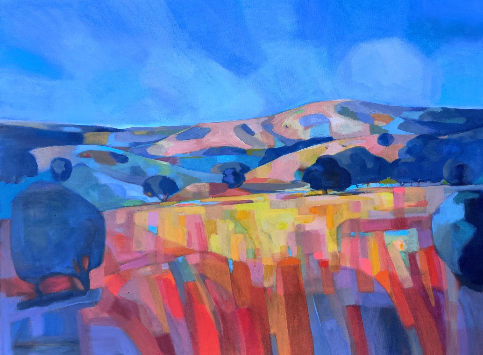 An abstraction of foreground color evokes meadow wildflowers and plant diversity, with views across golden grassy ridges to the peaks beyond. Oak trees in the sunshine, bay laurel and buckeye in cooler valleys. Higher up, redwoods catch drips of moisture on the misty ocean breezes.