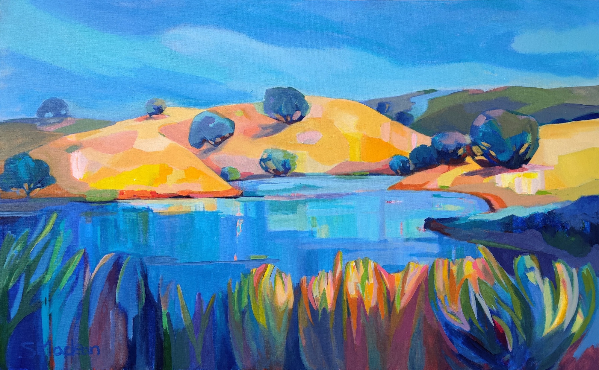 Nestled in the foothills of the coastal ranges, gathering the runoff from winter rains, the pond remains a refuge for flora and fauna through the dry seasons to come. A foreground of multi-coloured reeds evokes glints of late morning sunshine reflecting from the wind-rippled surface.