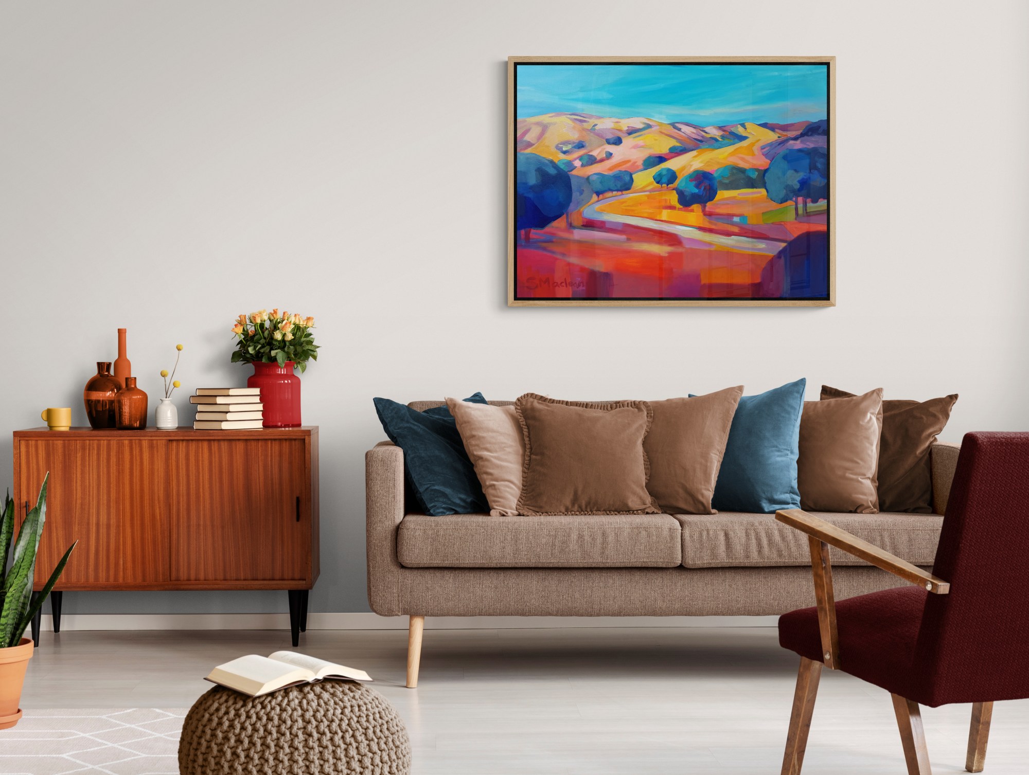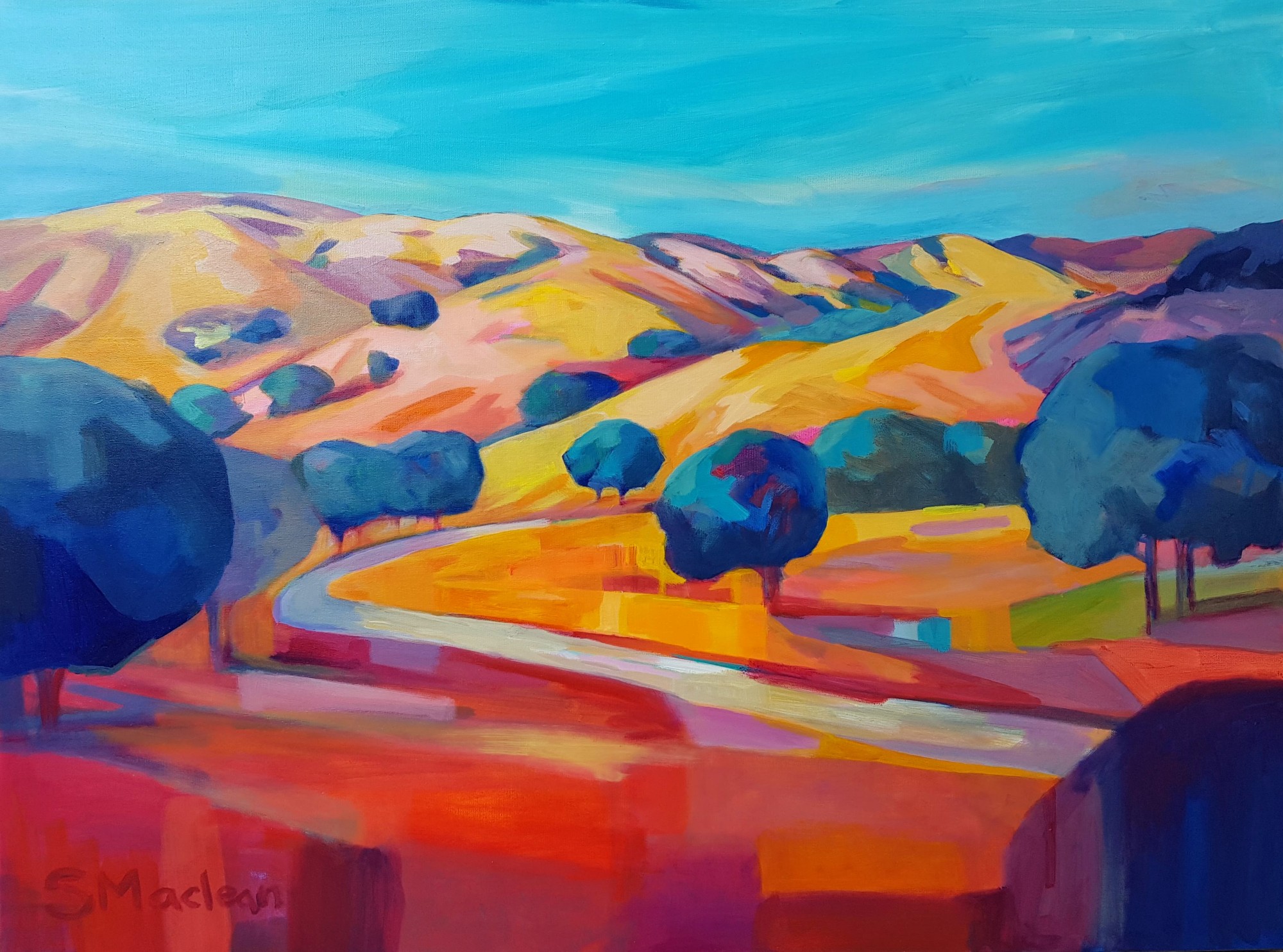 East of Gilroy, looking up to the wilderness of Henry Coe, enjoy this wide expanse of open space. The palette evokes the warmth of the late Summer in California. Live Oaks and valley Bay trees dot the golden hills, sustained by deep roots through the long dry season.