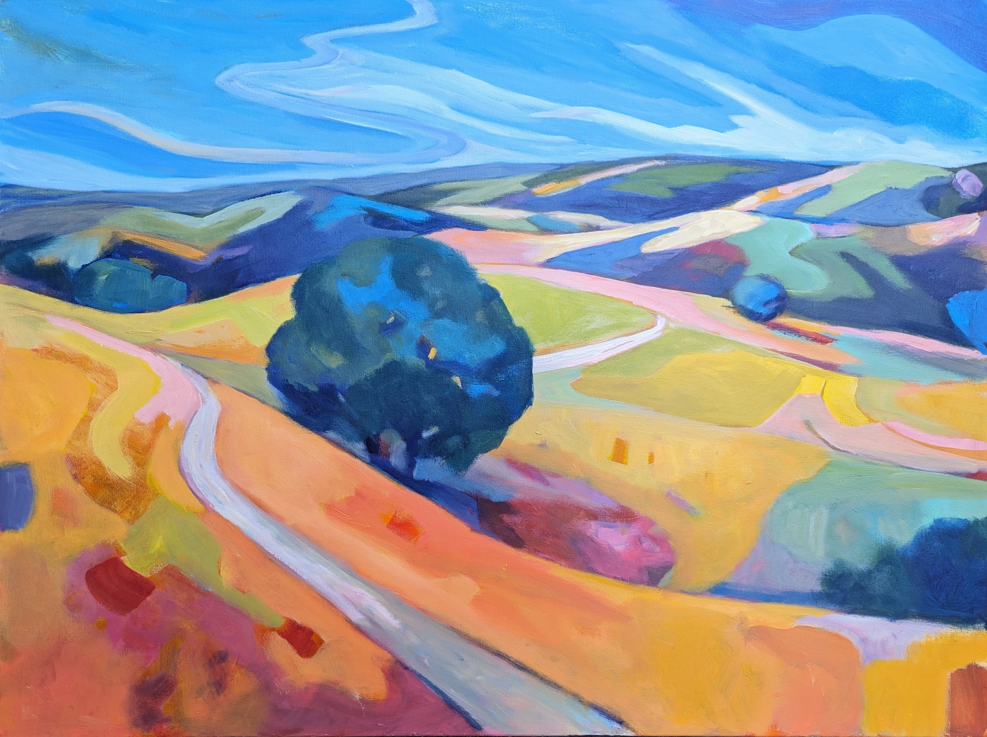 The trail takes us through a patchwork of meadows, turning golden as days become warmer. Beyond the stately, spreading oak, our eyes are drawn to vistas of the distant hills, and cloud patterns offering intrigue in the widening sky.